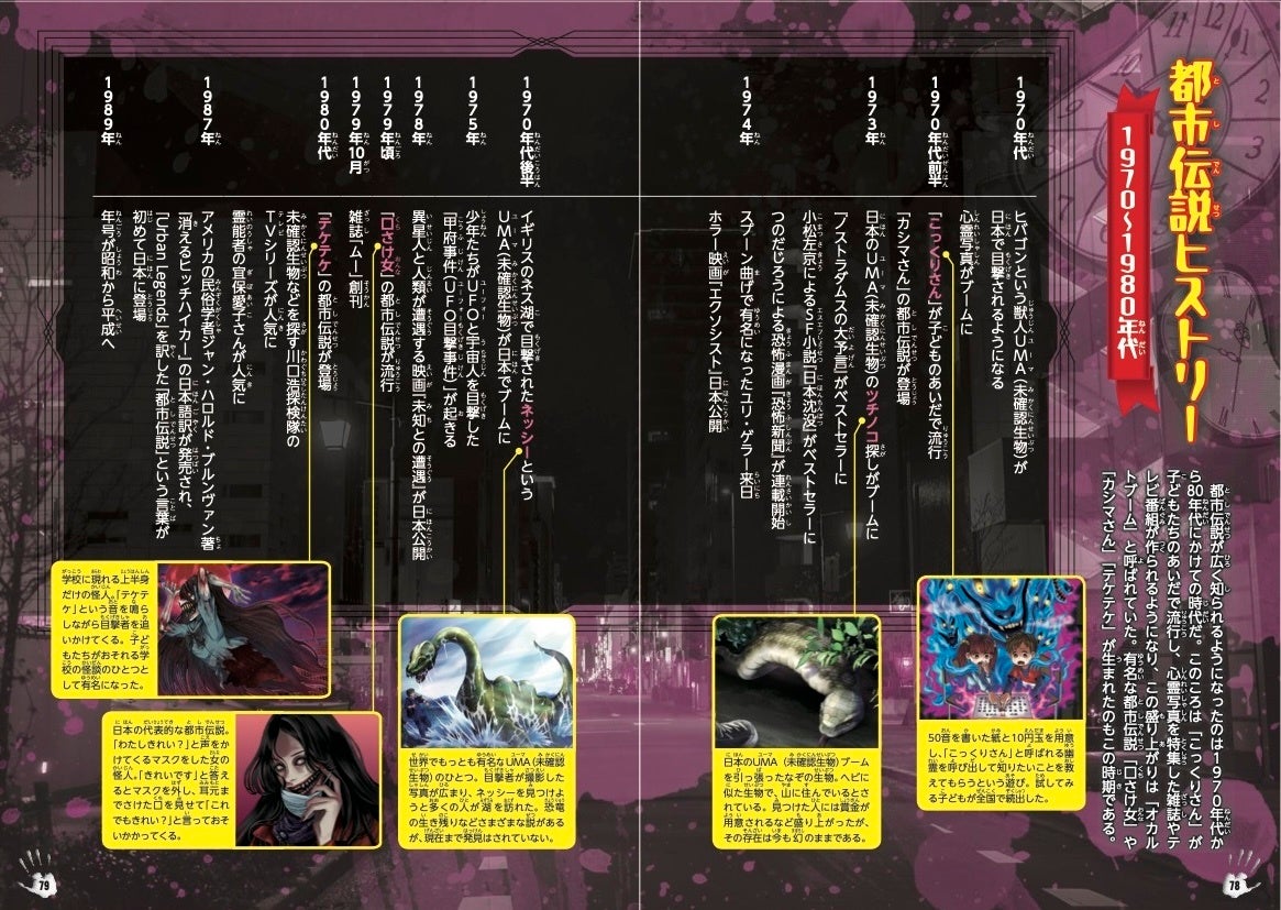 口裂け女やこっくりさん、ツチノコなど1970年代〜80年代に盛り上がったオカルトブームから、「学校の怪談」が人気を博した世紀末が迫る1990年代の心霊ブーム、インターネットが普及した2000年以降の怪異ブームを年表形式で網羅! これさえ読めば都市伝説マスターになれる!!
