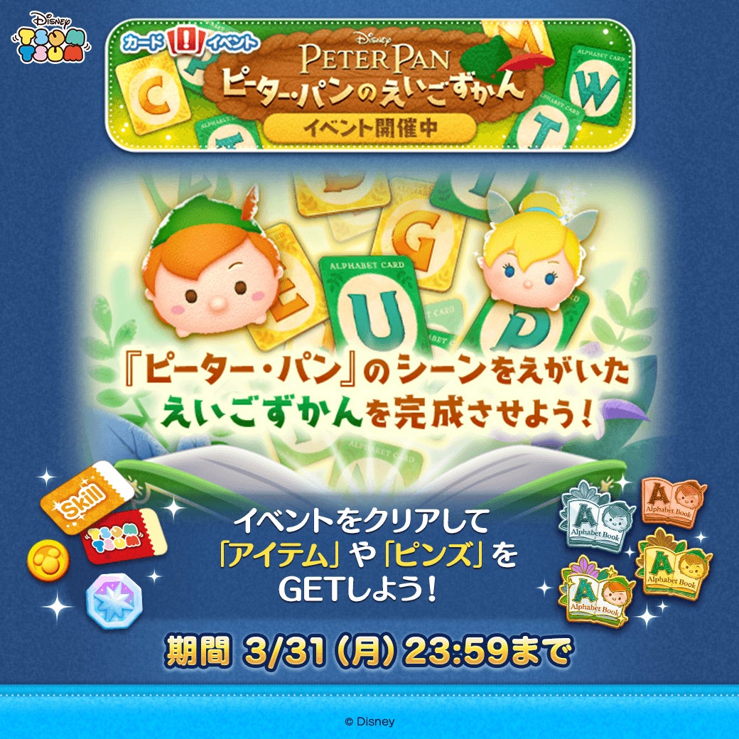 3月3日(月)より、ゲーム内にて新イベント「ピーター・パンのえいごずかん」を開催中です。ミッションをクリアして英単語を集め、『ピーター・パン』のシーンを描いた“えいごずかん”を完成させると、クリアしたエリアの数に応じてピンズがもらえます。また、ピンズ以外にもスキルチケットなどのプレゼントを手に入れるチャンスがあります。プレミアムBOXから出る今月の新ツムすべてにキャラクターボーナスがつき、ミッションをクリアしやすくなります。