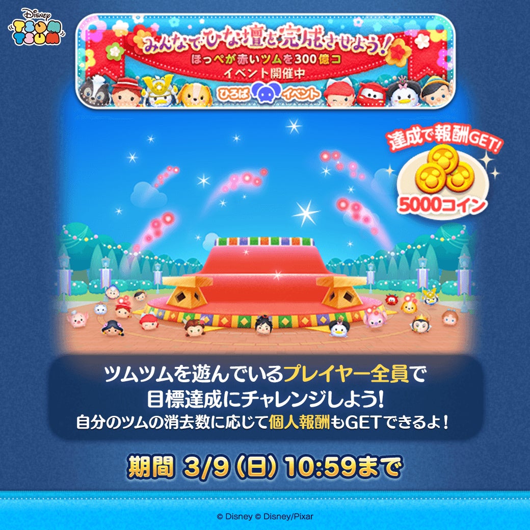 3月2日(日)より、ツムツムのコンテンツ「ひろば」にて、ツムツムプレイヤー全員で目標「ほっぺが赤いツムを300憶コ」の達成に挑戦するイベント「みんなでひな壇を完成させよう!」を開催中です。自分のツムの消去数に応じて個人報酬も獲得できます。詳しい遊び方と報酬内容は、ゲーム内の「ひろば」にてご確認いただけます。