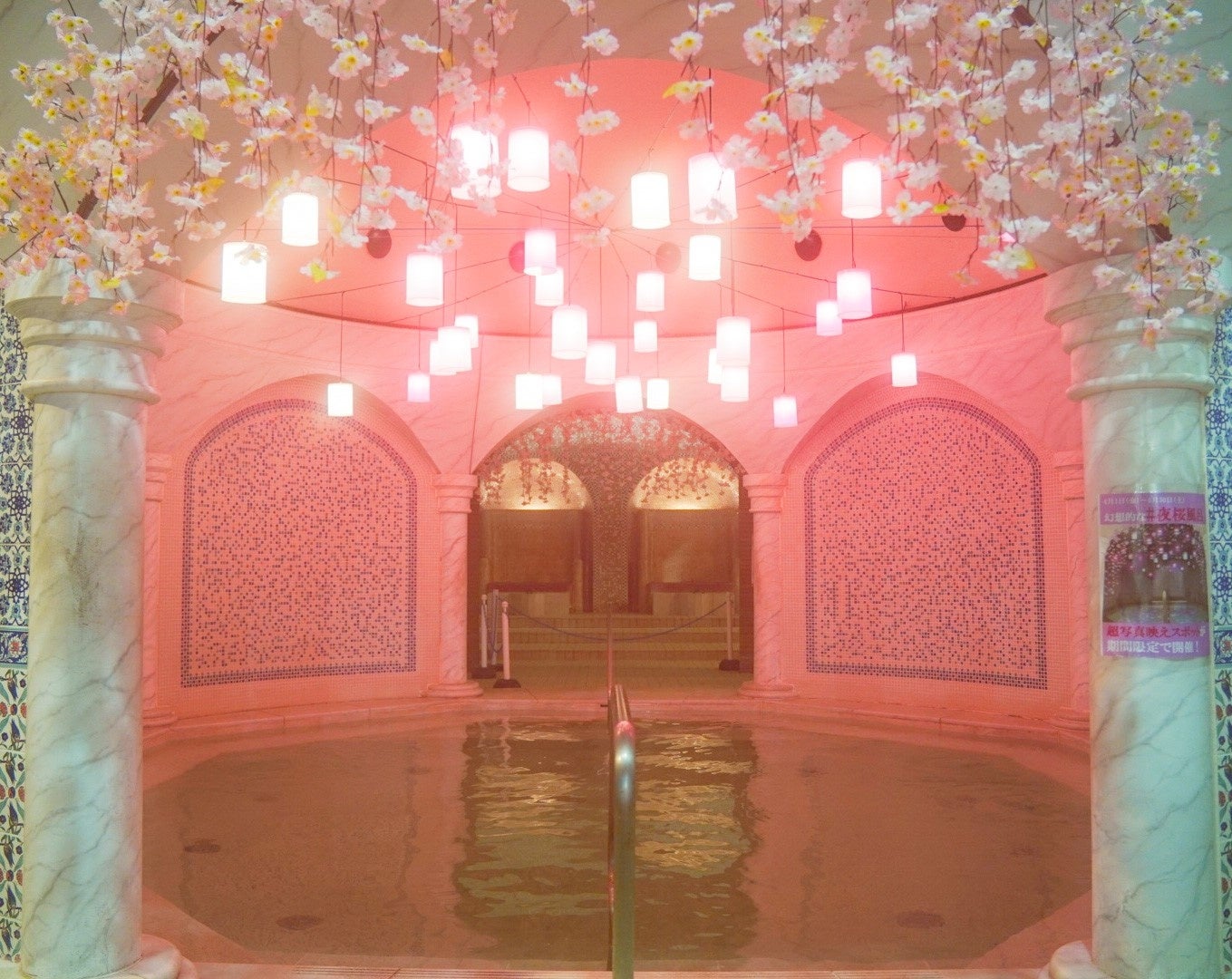 毎年大好評の季節の変わり湯「アヒルの花筏風呂」が今年も屋内エリア「トルコ風ハマム」に登場! 天井からは桜色のランタンによる淡い光が灯り、湯面には約3,000 個もの可愛らしいアヒルのおもちゃたちが浮かびます。まるで花筏のようなアヒルとともに、ユネッサンならではのフォトジェニックなバスタイムをお楽しみいただけます。
