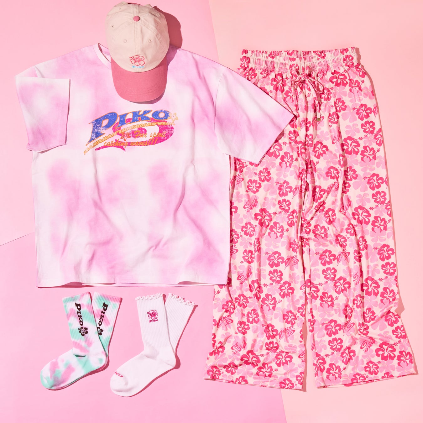 今回のコレクションのテーマカラーはピンク!大きなフロントロゴが目を引くタイダイTシャツや、ハワイっぽさたっぷりの派手柄イージーパンツなど、エネルギッシュな主役級アイテムがそろいます。さらに、ハイビスカスとロゴ刺繍をワンポイントで施した、バイカラーのキャップや、足元からリゾート気分を盛り上げるソックスまで、バリエーション豊かなピンクのラインアップが勢ぞろい。ひとつ取り入れるだけで、一気に旬の“平成かわいい”スタイルを叶えてくれる、PLAZA限定の特別なコレクションです。