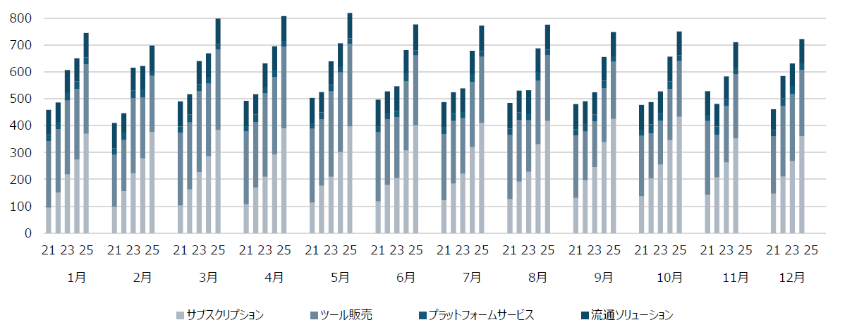 サブスクリプションは、CLIP STUDIO PAINT サブスクリプション売上です。ツール販売には、一括支払いモデルのダウンロード版や法人向けライセンスの売上などが含まれます。プラットフォームサービスには、CLIP STUDIO WEBサービスでの売上等が含まれます。流通ソリューションには、電子書籍及びDC3に関連する売上が含まれます。