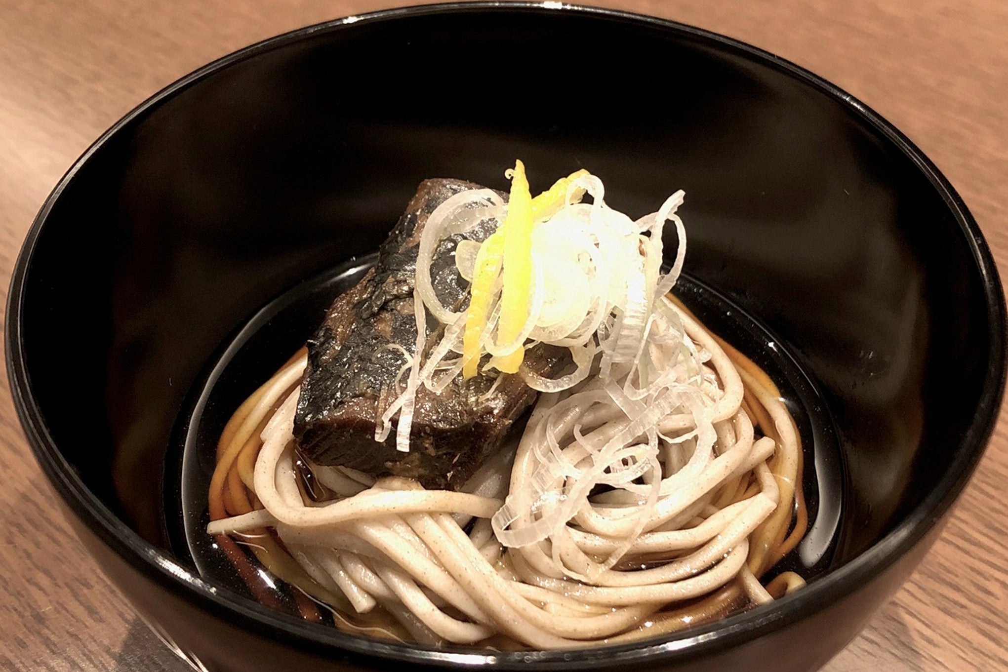 にしんや白ネギ、ゆず、紅白削りかまぼこをトッピングした年越しそばを