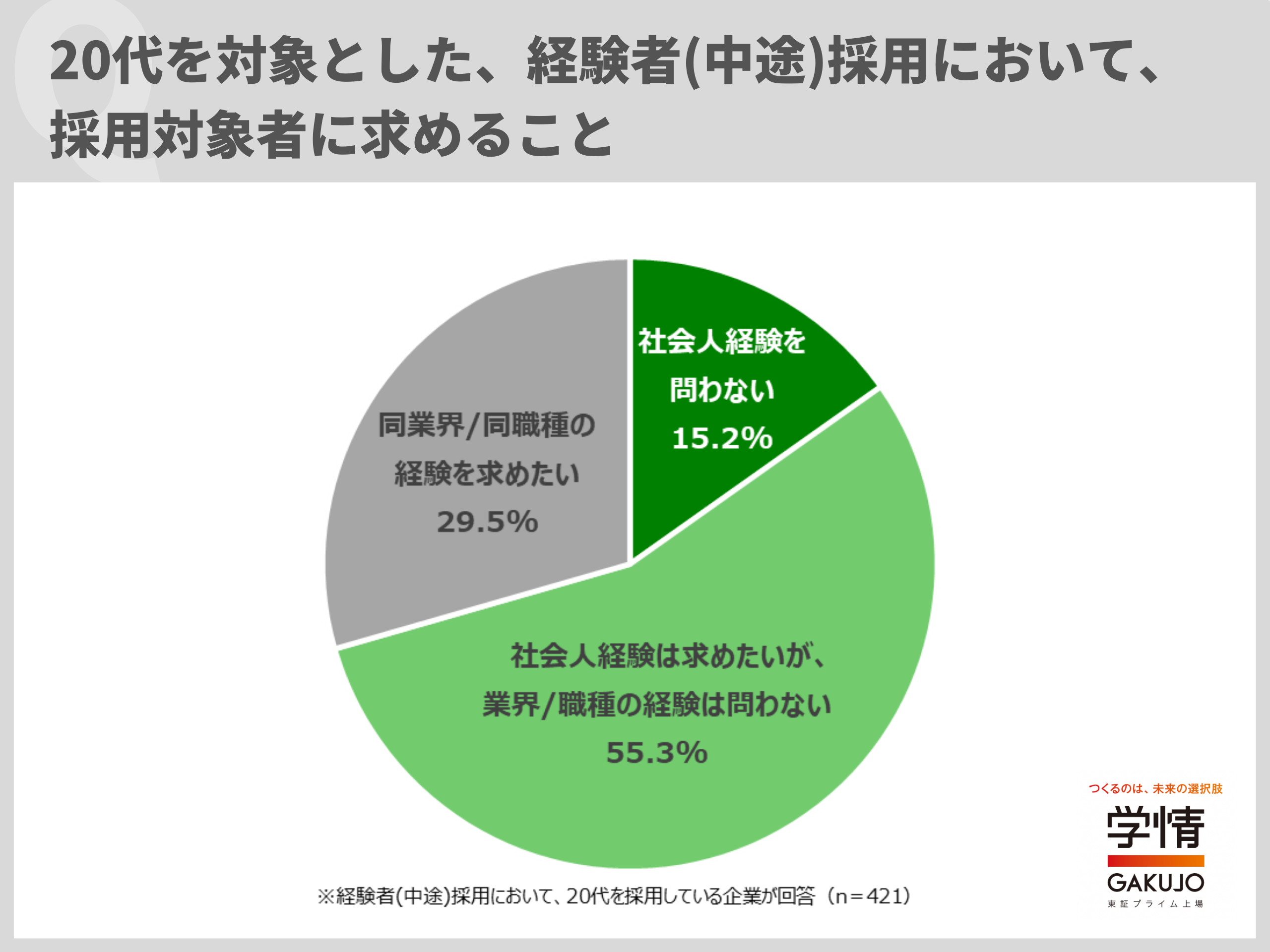 20代を対象にした経験者(中途)採用において、「社会人経験は求めたいが、業界/職種の経験は問わない」と回答した企業が、55.3%で最多となりました。「社会人経験を問わない」と回答した企業も15.2%に達し、「業界/職種の経験は問わない」とした企業が7割を超えました。20代を対象にした採用では、経験者(中途)採用においても、経験よりもポテンシャルが重視されていると言えます。