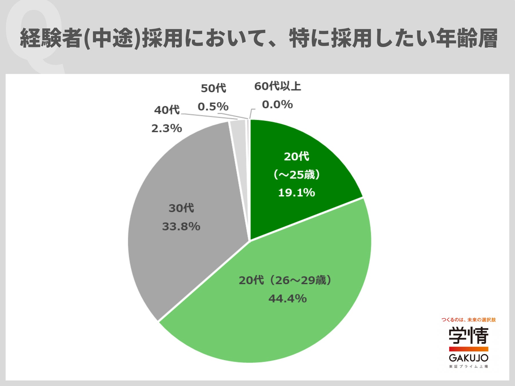 経験者(中途)採用において、特に採用したい年齢層は「20代(26~29歳)」が44.4%で最多となりました。「20代(~25歳)」と回答した企業も19.1%に上り、「20代」と回答した企業が6割以上を占めました。経験者(中途)採用のおいても、若い世代を採用したいと考える企業が多いことが分かります。