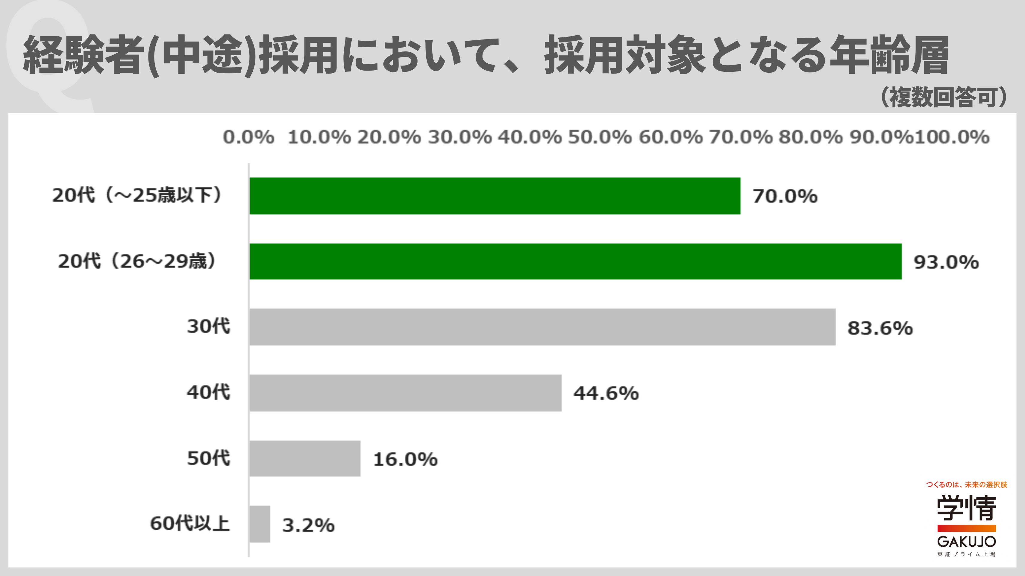 経験者(中途)採用において、対象となる年齢層は、「20代(26~29歳)」が93.0%で最多。次いで、「30代」83.6%、「20代(~25歳)」70.0%が続きました。