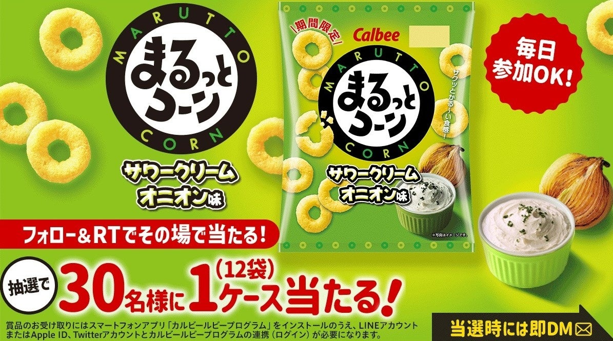 カルビーPR部公式アカウントをフォローしリツイートすることで抽選で「まるっとコーン サワークリームオニオン味」1ケース(12袋入り)が当たるインスタントウィンキャンペーンを実施します。