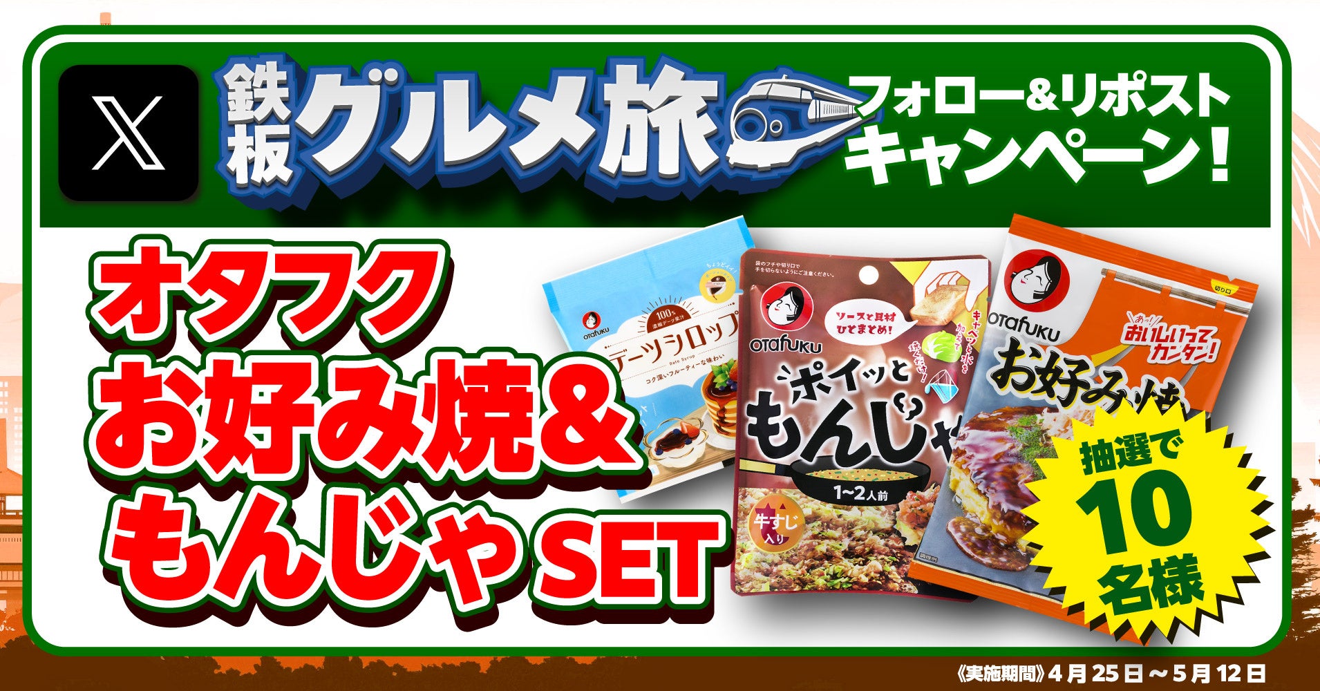 株式会社物語コーポレーション(本社:愛知県豊橋市/代表取締役社長:加藤 央之)は、全国20店舗展開中の『お好み焼本舗』(以下、おこほん)で、春期間限定メニュー「鉄板グルメ旅」の販売を記念して、2025年4月25日(金)より、「オタフクお好み焼&もんじゃセット」が当たる、Xフォロー&リポストキャンペーンを開催いたします。