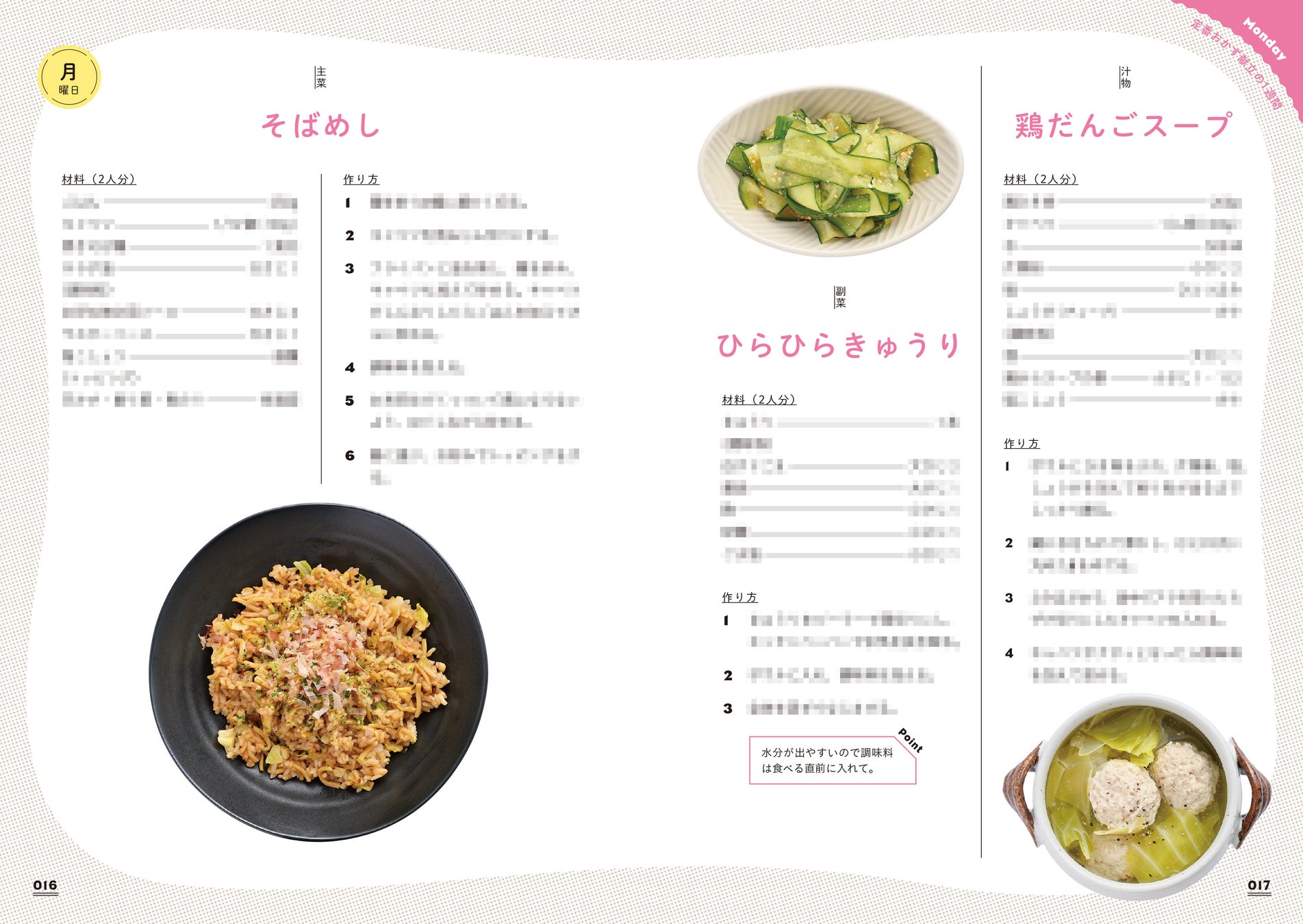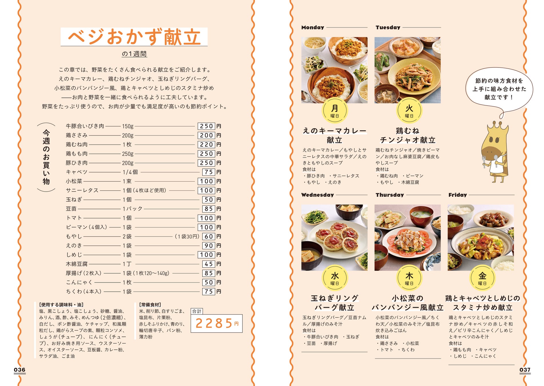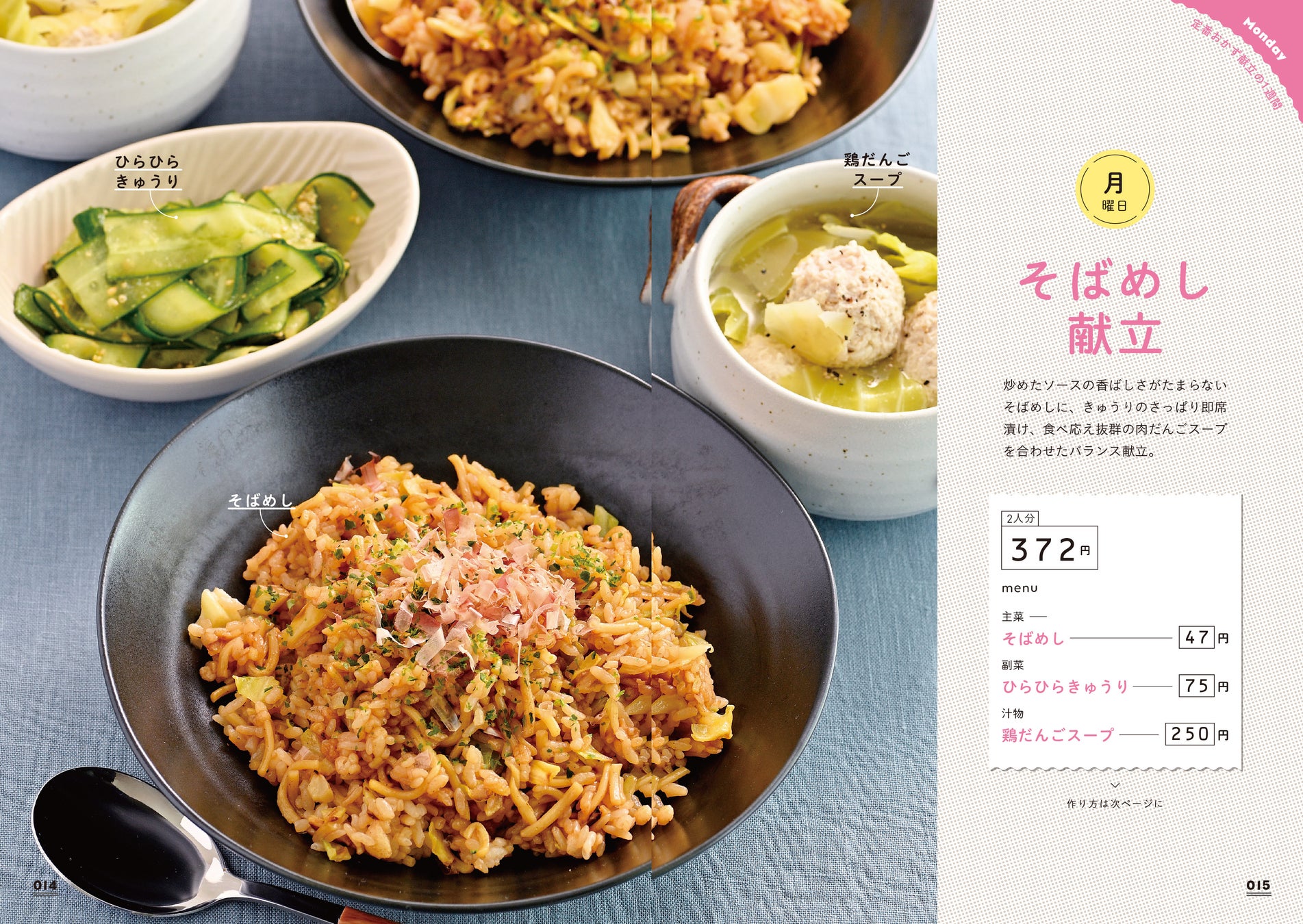そばめし、鶏チャーシュー、豆腐つくね、チキンカツ、納豆塩昆布パスタなど。どれもお手軽価格の材料で作れてボリューム満点で食べ応え抜群の主菜を中心に構成しています。