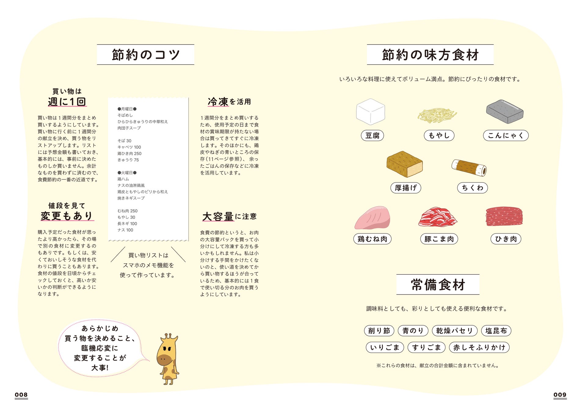 節約のコツや献立の立て方、調理のポイントを紹介しています。例えば、あらかじめ買うものを決めておくことで余計なものを買わないようにしたり、実際の価格を見て臨機応変に変更したり。きりんさん流の節約のコツがたっぷりあります。