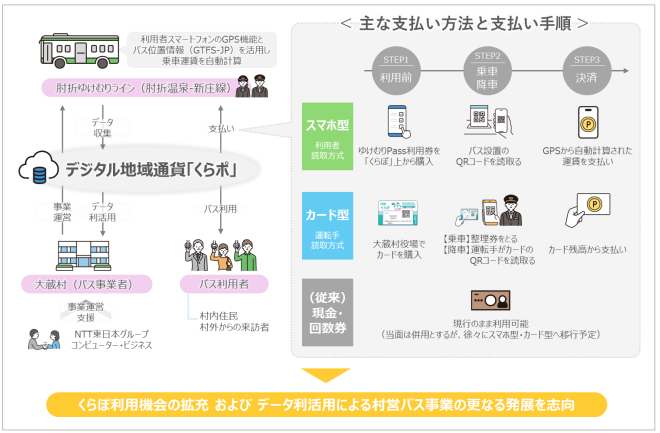 バス運賃決済システム導入による「くらポ」の更なる利用推進、村内外の利用者および交通事業者の利便性向上の実現はもちろんのこと、大蔵村とNTT東日本をはじめとしたNTT東日本グループ、コンピューター・ビジネスは、村民の皆様がいつまでもスマートかつ安心安全に暮らすことができる「サステナブルな地域」の実現を目ざして、地域通貨の発展、およびその他分野のデジタルトランスフォーメーションも連携して推進していきます。