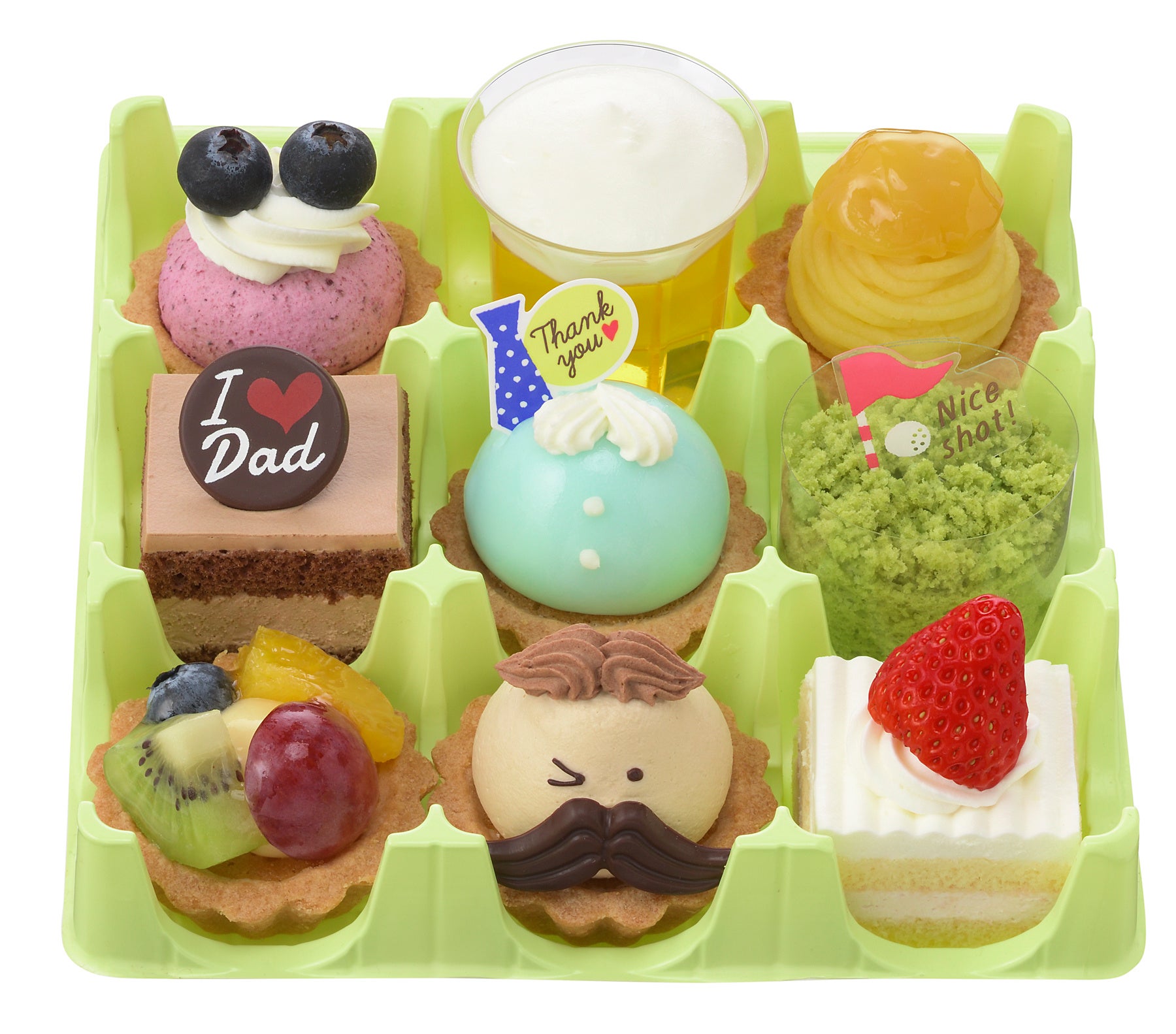お父さんをモチーフにしたケーキや彩りのよい季節のフルーツを使ったケーキを、バラエティ豊かに詰め合わせました。お父さんに感謝を伝えながら家族みんなでプチケーキを囲み、笑顔あふれるひと時をお過ごしください。