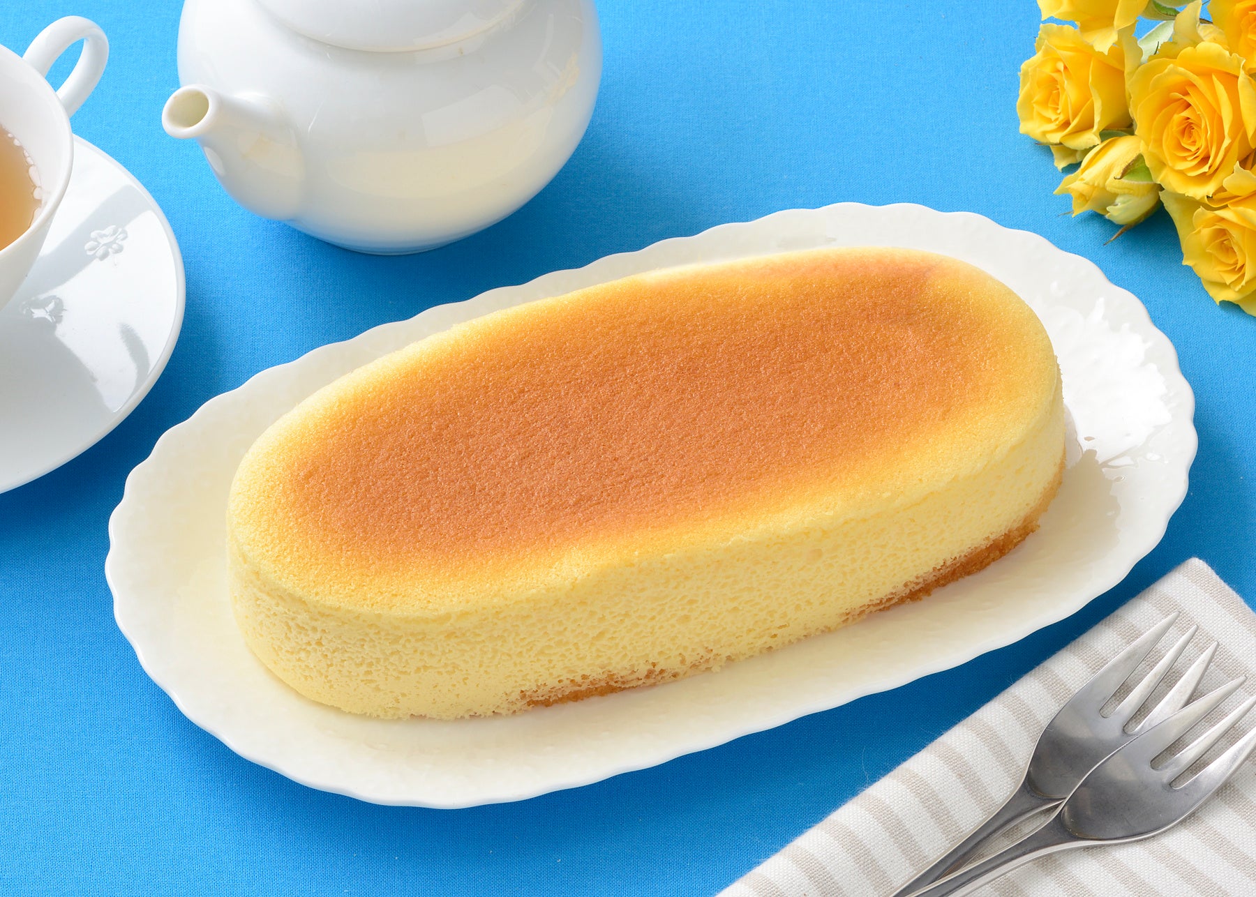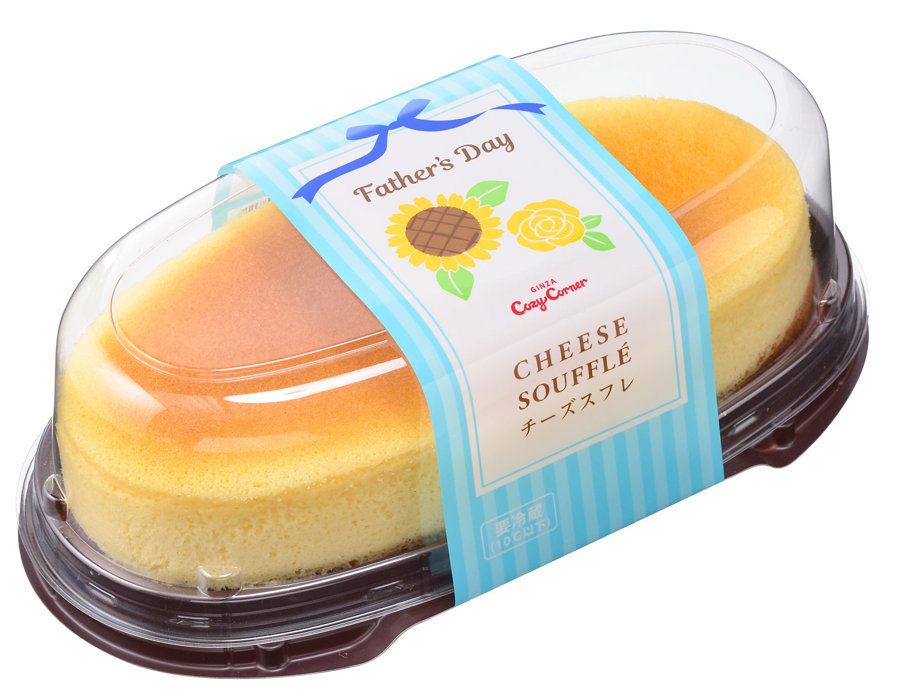 父の日専用デザインのフィルムでラッピングしたチーズスフレ。“しっとり、ふわシュワッ”の食感がおいしさの秘密。メレンゲをきめ細かく泡立てて、気泡をつぶさないようにゆっくり蒸し焼きにしました。チーズの旨みと食感をお楽しみください。