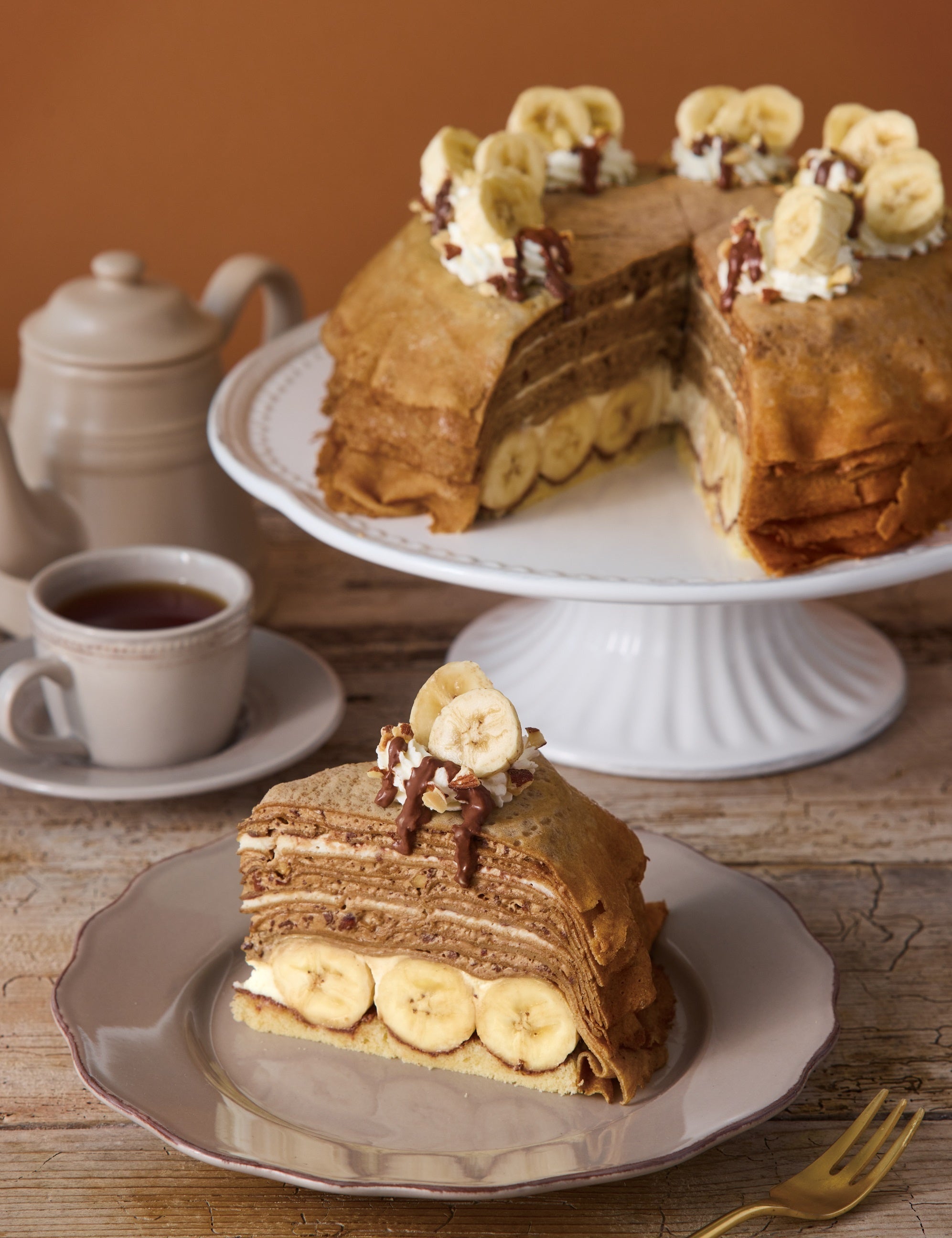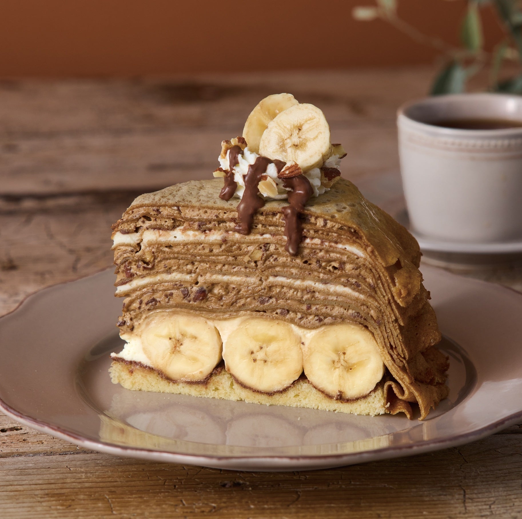 自家製のクレープ生地にコーヒー香るアーモンドモカクリームとバナナ、ラム酒を加えたカスタードクリームを重ねました。チョコチップとアーモンドのザクザク食感もお楽しみいただけます。