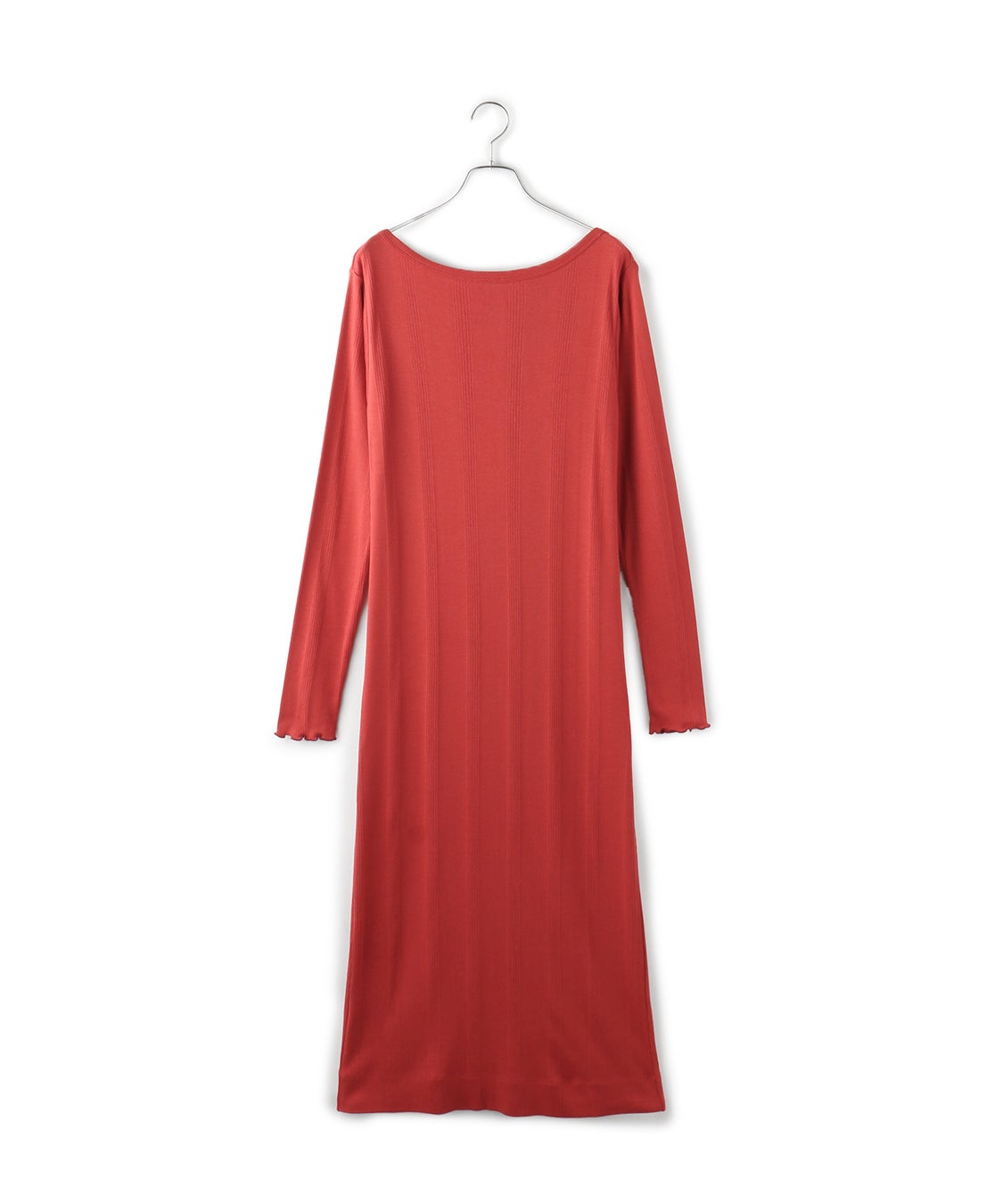 デコルテラインを綺麗に見せてくれるボートネックに、身幅をすっきりさせた女性らしい滑らかなシルエット。裾は糸をきれいに整えて華奢な表情が出るデザインにしました。