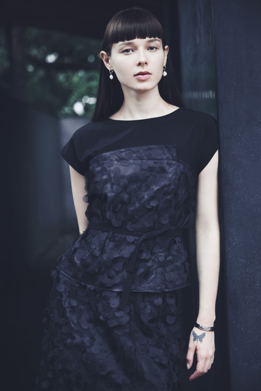 背中を調節用のレースアップ仕様にして、サイズ感とシルエット調節を可能にしたキャミワンピースです。ジャケットとセットアップで着ることでトレンド感のあるスタイリングが叶う、新しい提案です。