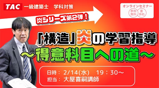 【TAC建築士】オンラインセミナー開催 一級建築士(学科)「構造」炎の学習指導~得意科目への道~