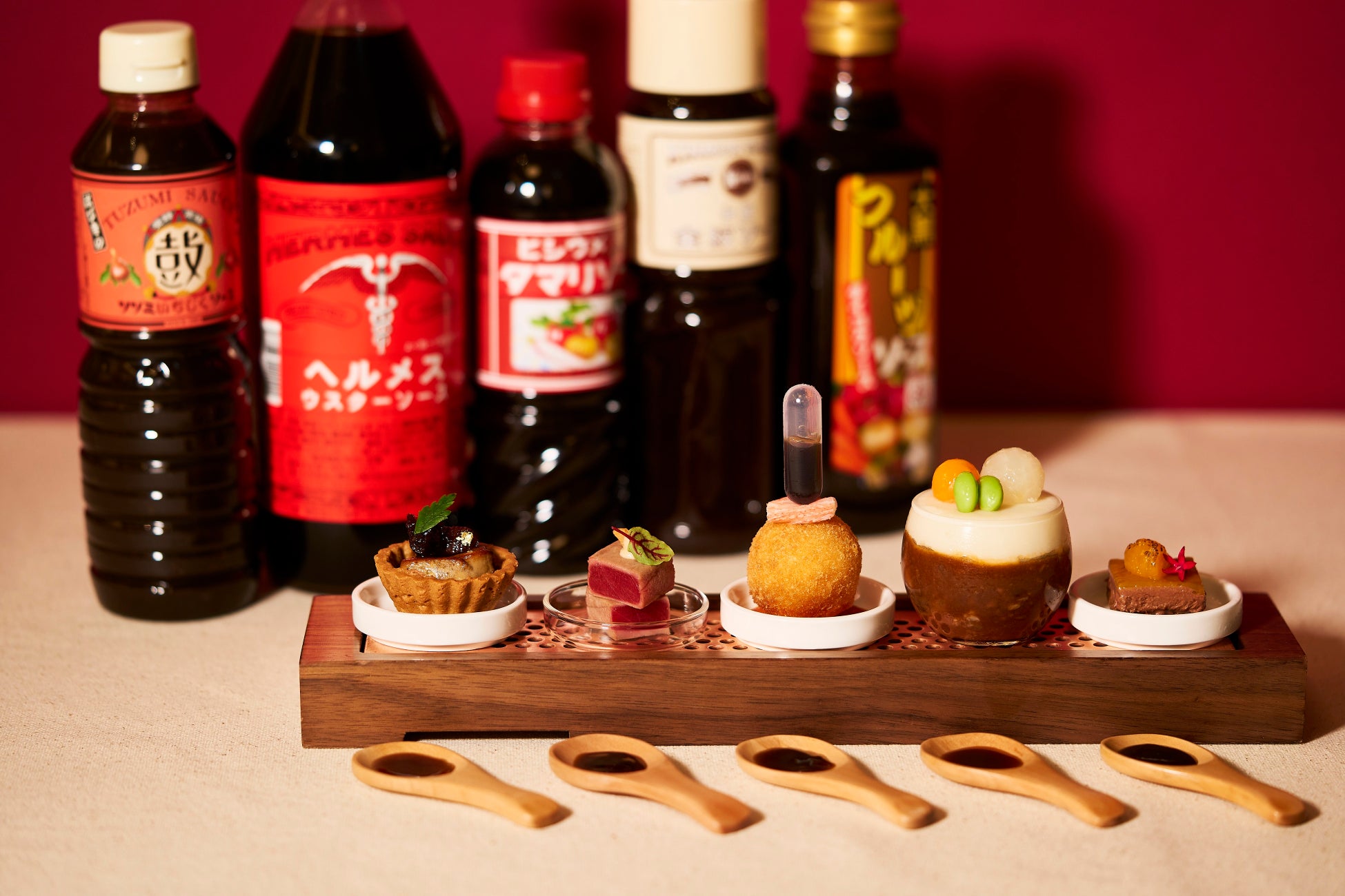 ソースは、古くから大阪の家庭の食卓における「洋」を代表する存在であり、「ちょっと贅沢」で「ごはんがたくさん食べられる」という便利な調味料として親しまれてきました(*)。多くの家庭では、数種類のソースを常備し、料理によって使い分けることもあります。また大阪の業務用スーパーでは、圧倒的な種類のソースが販売されており、揚げ物を扱う店舗やお好み焼き店ではソースを混ぜ合わせ、店舗オリジナルの味を作り出しています。そんな大阪の食文化と深く関わるソースですが、食べ比べする機会は滅多にないものです。そこでOMO7大阪では、各ソースの特徴を活かしたオリジナルのピンチョスを提供し、ソースの味を比べながら、その奥深さを感じられるイベントの実施に至りました。