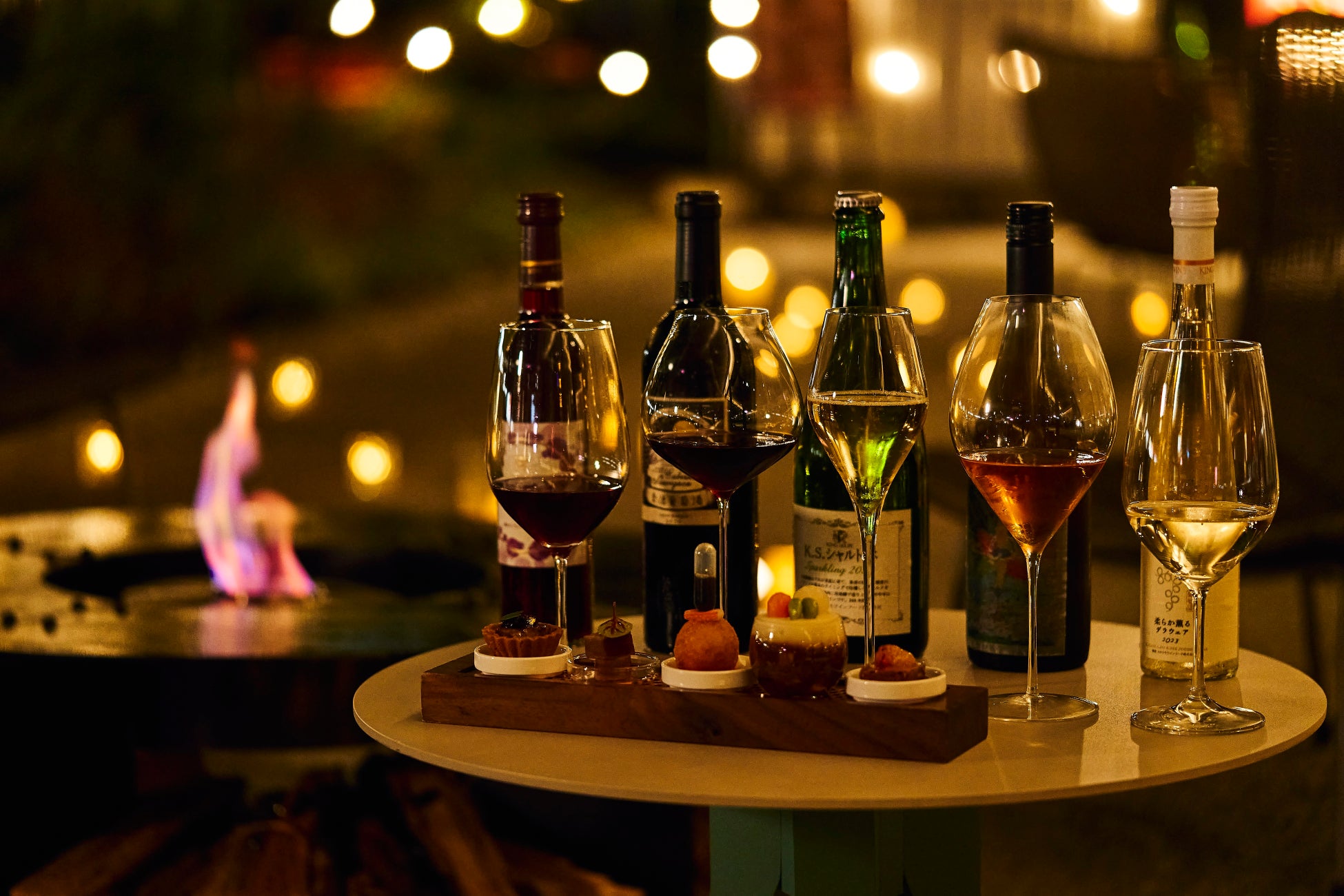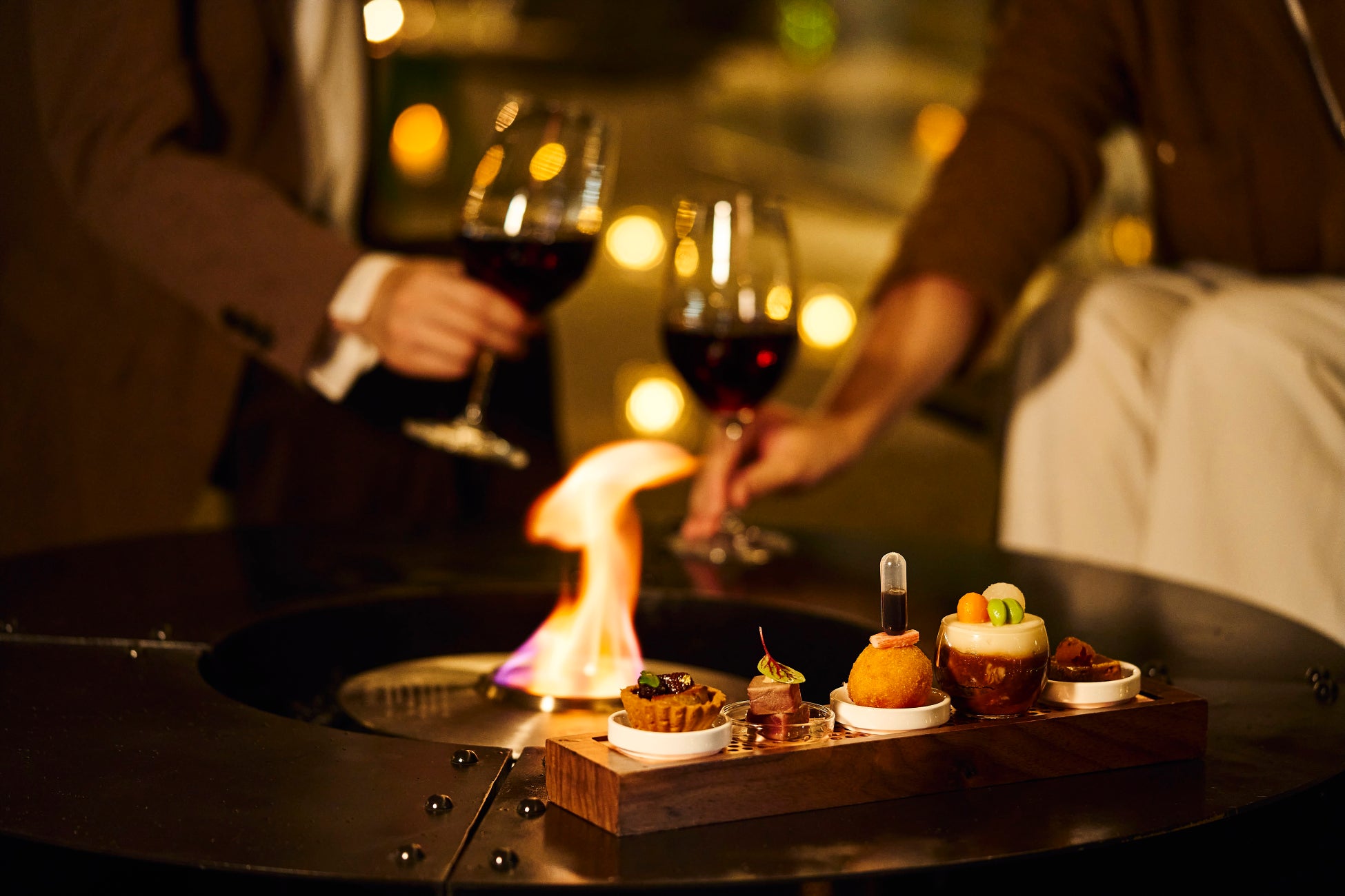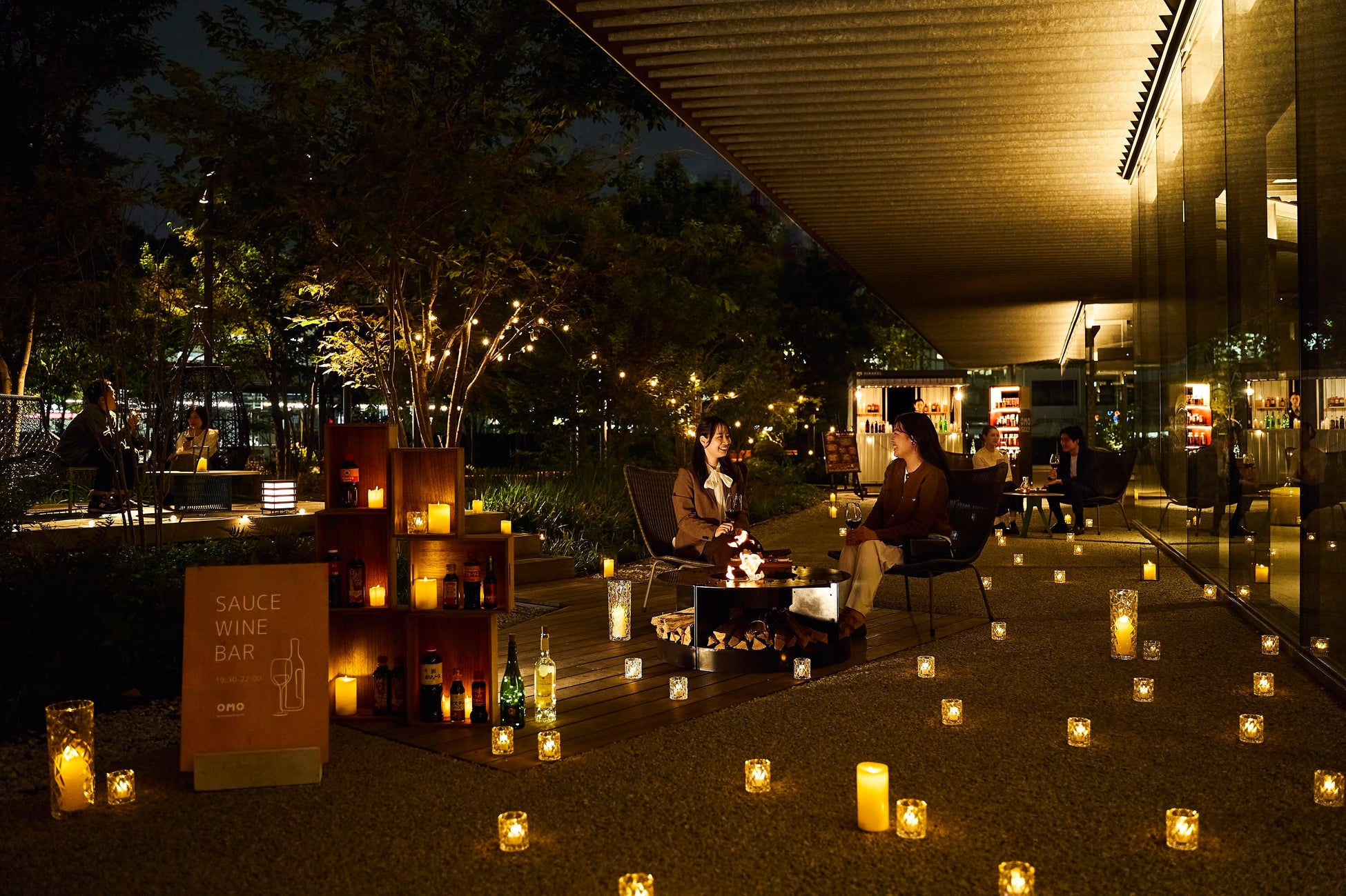 OMO7大阪のホテル棟目の前に広がるガーデンエリア「みやぐりん」の一角をキャンドルライトと焚き火で灯します。開放感抜群の空間で焚き火を囲みながら、5種類の地ソースを使用したピンチョスと、大阪のワイナリーで造られたワインを楽しむことができます。街ナカでありながら、非日常的で贅沢なひとときを演出します。