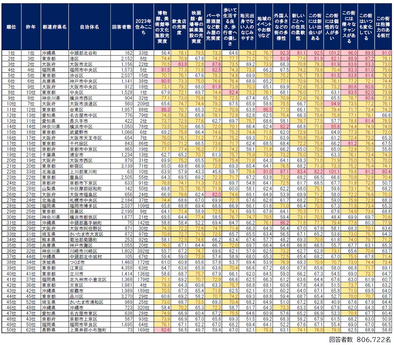 コンシャスな街ランキングは、現在居住している街について、14項目の設問(①博物館、美術館等の文化施設充実度②飲食店の充実度③映画館、劇場等の娯楽施設の充実度④バーや居酒屋など飲み屋の充実度⑤歩いて生活する良さ、歩行者への優しさ⑥地元出身でない人のなじみやすさ⑦地域のイベントやお祭りなど⑧外国人の多さなどの街の多様性⑨新しいことへの住民の柔軟性⑩この街には新しい出会いがある⑪この街には個性的な人が多い⑫この街には様々なチャンスがある⑬この街はいつも変化している⑭この街は抱擁力のある街だ)に対して、そう思う=100点、どちらかといえばそう思う=75点、どちらでもない=50点、どちらかといえばそうは思わない=25点、そうは思わない=0点、の5段階評価をしてもらい、その平均値を集計して作成しています。