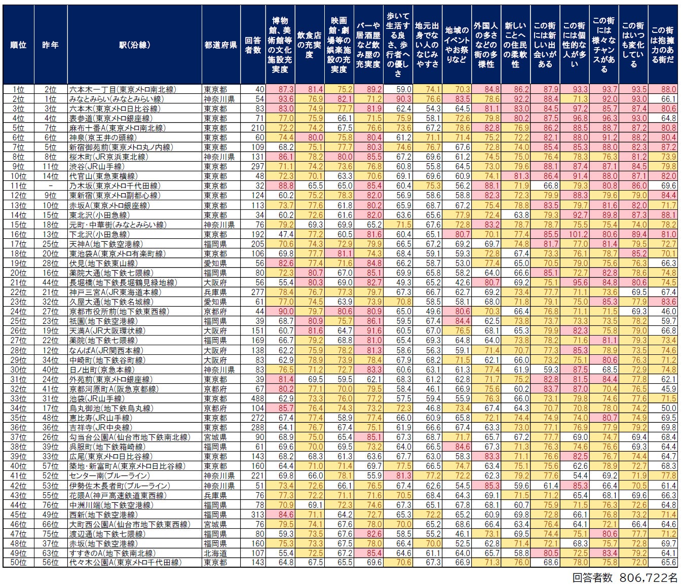 ●トップ3の駅は、いずれも「博物館、美術館等の文化施設充実度」、「新しいことへの住民の柔軟性」、「この街には新しい出会いがある」、「この街には様々なチャンスがある」、「この街はいつも変化している」の5項目について、偏差値80以上の極めて高い評価を得ています。