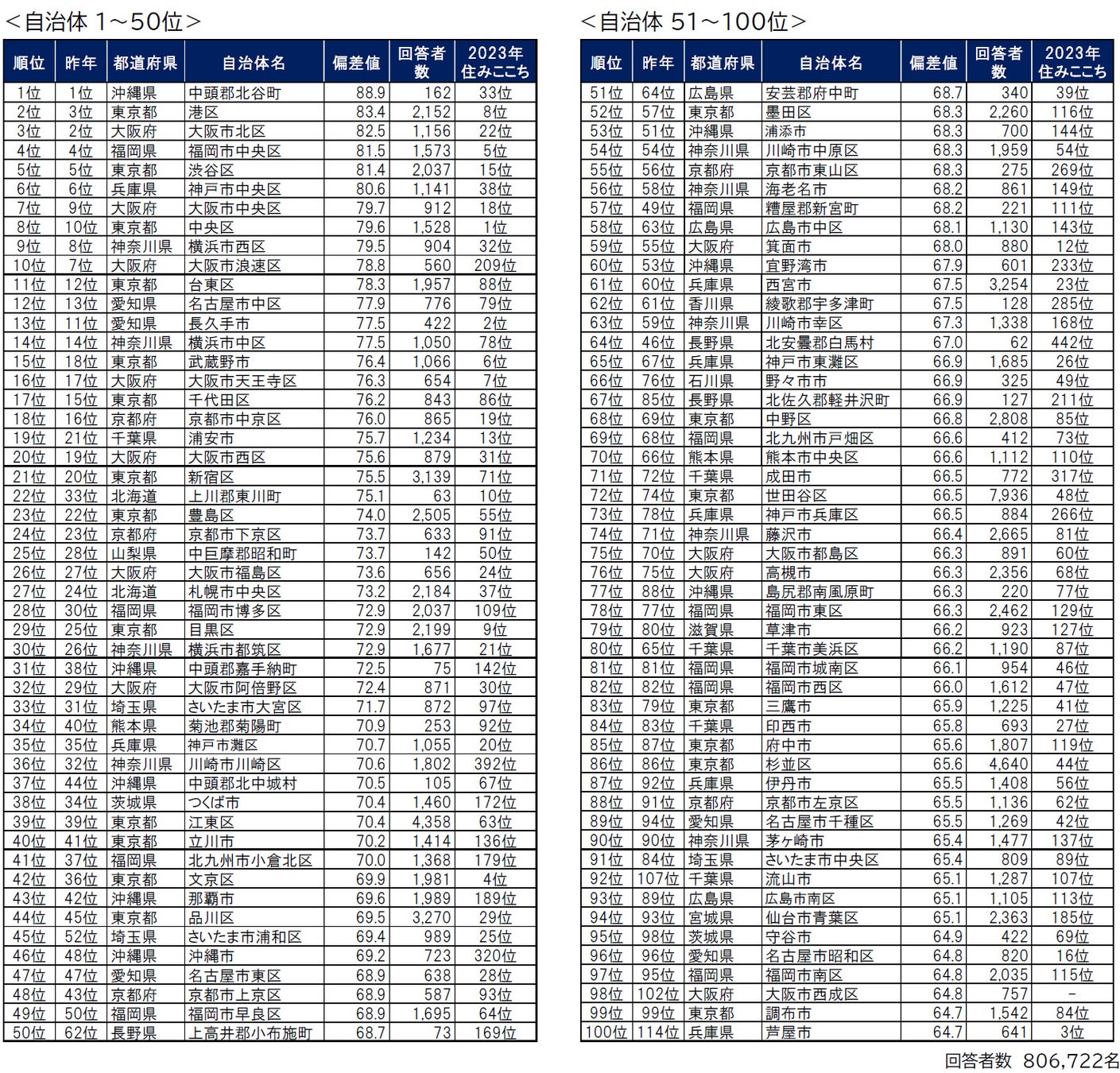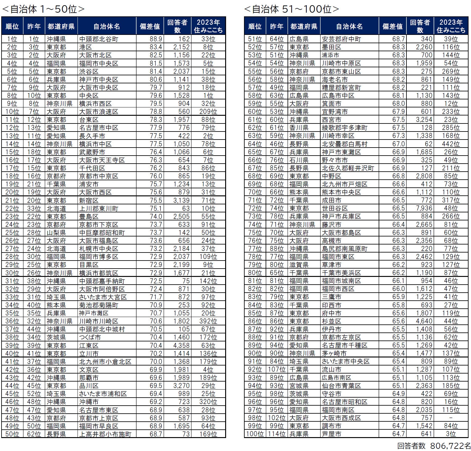 •「2023年住みここち」は、2023年8月9日に発表している全国版の順位を表示し、“ー”の自治体は、累計回答数が50名未満、もしくは偏差値が50未満だったためランキング集計対象外としています。
