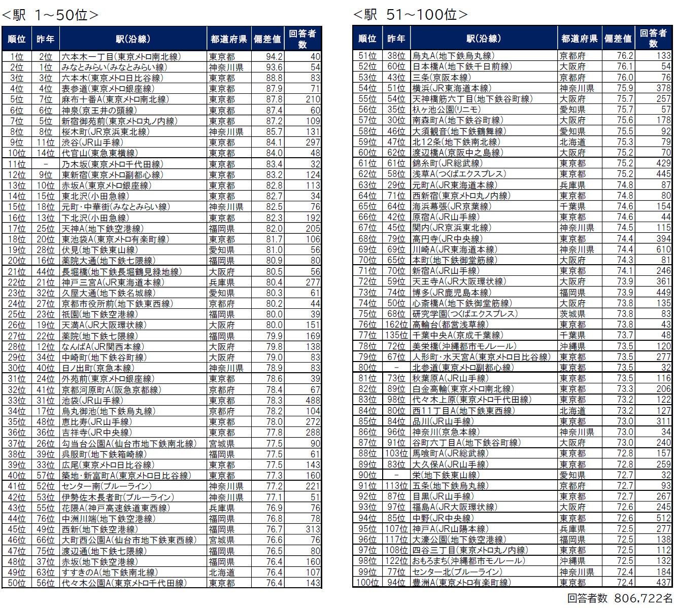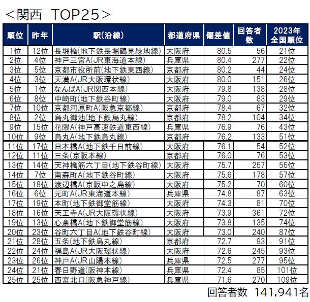 ●関西は、昨年は12位だった長堀橋(大阪府)が1位です。2位は神戸三宮A(兵庫県)(三ノ宮・神戸三宮など6つの近接駅を統合)、3位は京都市役所前(京都府)です。トップ25の地域別では、大阪府が13駅、京都府と兵庫県がそれぞれ6駅ランクインしています。