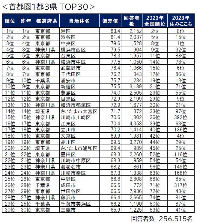 ●首都圏1都3県のトップ3は、1位港区、2位渋谷区、3位中央区で、いずれも東京都23区の自治体となっています。トップ30のうち、17自治体が東京都、8自治体が神奈川県の自治体です。