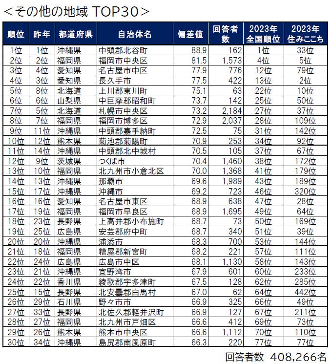 ●その他の地域のトップ2は3年連続で、1位沖縄県中頭郡北谷町、2位福岡県福岡市中央区です。3位は愛知県名古屋市中区です。トップ10では、9位に沖縄県中頭郡嘉手納町(昨年11位)、10位に熊本県菊池郡菊陽町(昨年12位)が順位を上げてランクインしています。トップ30では、27位に長野県北佐久郡軽井沢町(昨年33位)、30位に沖縄県島尻郡南風原町(昨年34位)が昨年から順位を上げてトップ30入りしています。