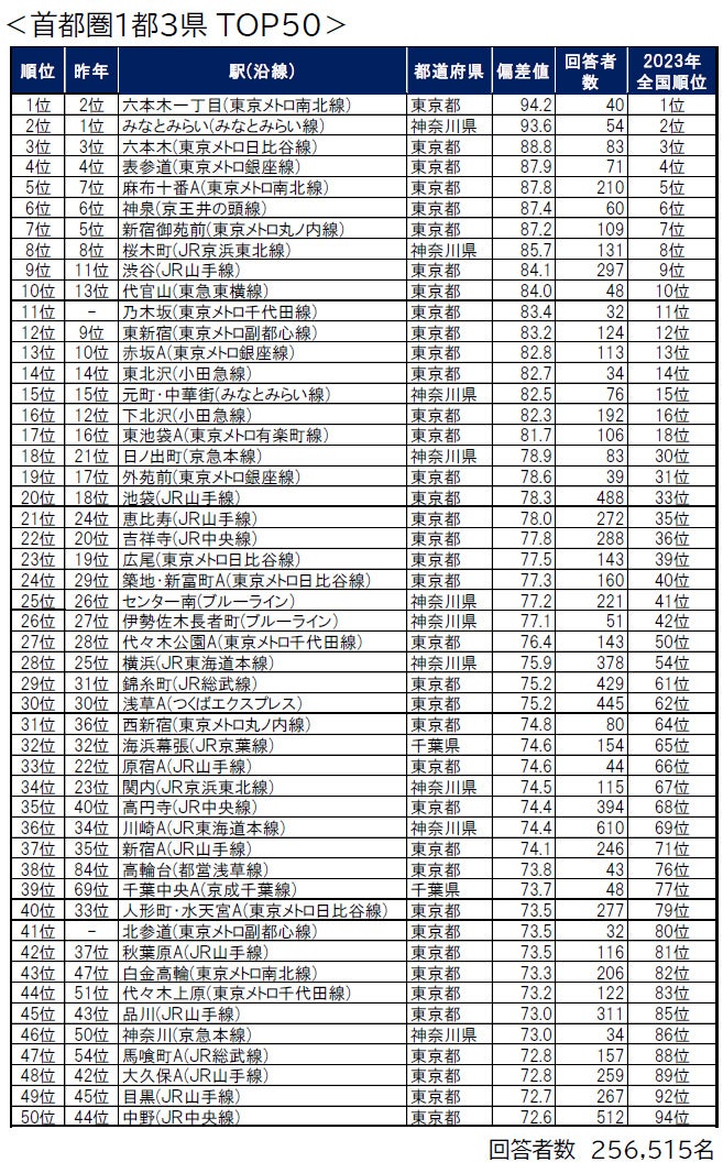 ●首都圏1都3県は、1位は六本木一丁目(東京都)、2位はみなとみらい(神奈川県)、3位は2年連続で六本木(東京都)です。トップ2の六本木一丁目とみなとみらいは、いずれも偏差値90台の極めて高い評価を得ています。1位の六本木一丁目と3位の六本木は、「コンシャスな街(自治体)」で2位の東京都港区に位置する駅です。トップ50では、昨年は回答者数30名未満で集計対象外だった乃木坂(東京都)(11位)と北参道(東京都)(41位)が新たにランクインしています。