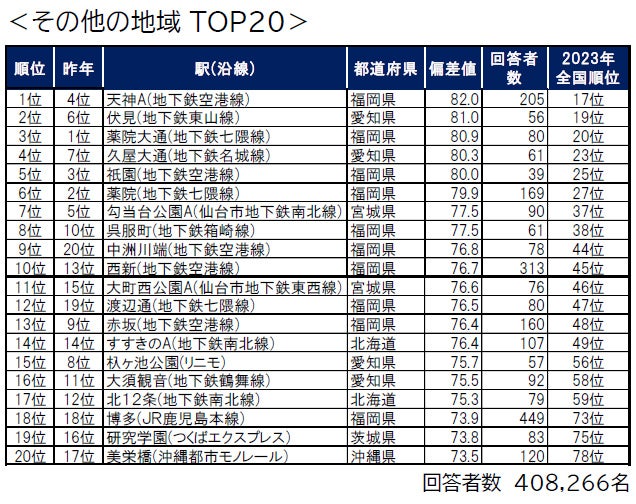 ●その他の地域は、1位天神A(福岡県)、2位伏見(愛知県)、3位薬院大通(福岡県)です。トップ10では、9位に中洲川端(福岡県)(昨年20位)、10位に西新(福岡県)(昨年13位)が順位を上げてランクインしています。トップ10の地域別では福岡県が最も多く7駅、次いで愛知県の2駅、宮城県の1駅という結果になっています。