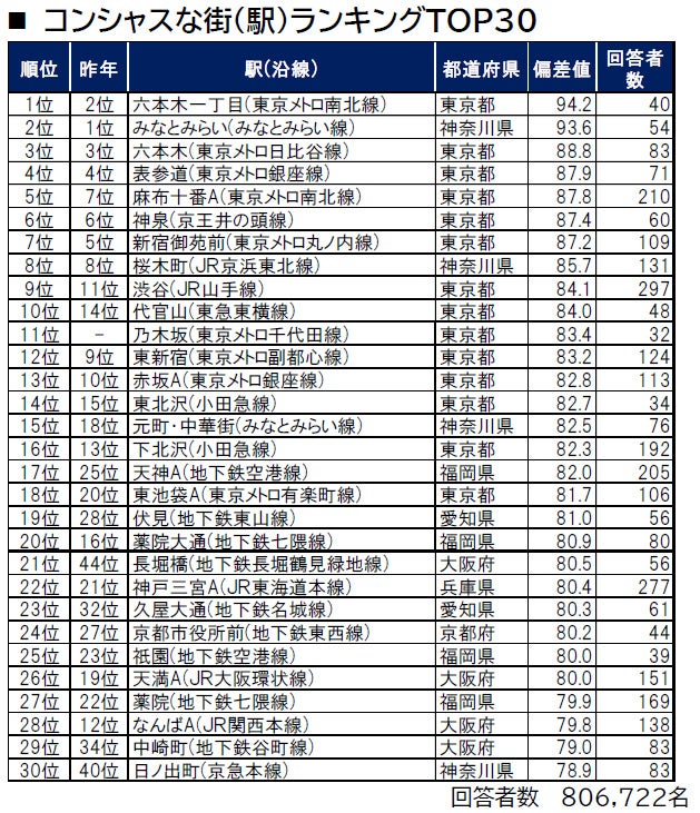 •「コンシャスな街(駅)ランキング」の昨年の順位が“-”の駅は、「コンシャスな街ランキング2022<全国版>」で偏差値が50未満、または回答者数が30名に及ばずランキング対象に含まれなかった駅を表しています。