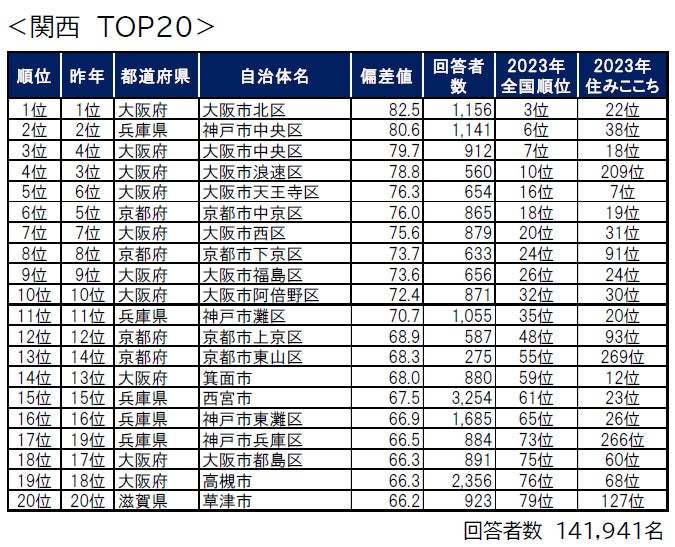 ●関西のトップ2は3年連続で、1位大阪府大阪市北区、2位兵庫県神戸市中央区です。3位は大阪府大阪市中央区です。トップ20では、10自治体が大阪府、5自治体が兵庫県、4自治体が京都府です。