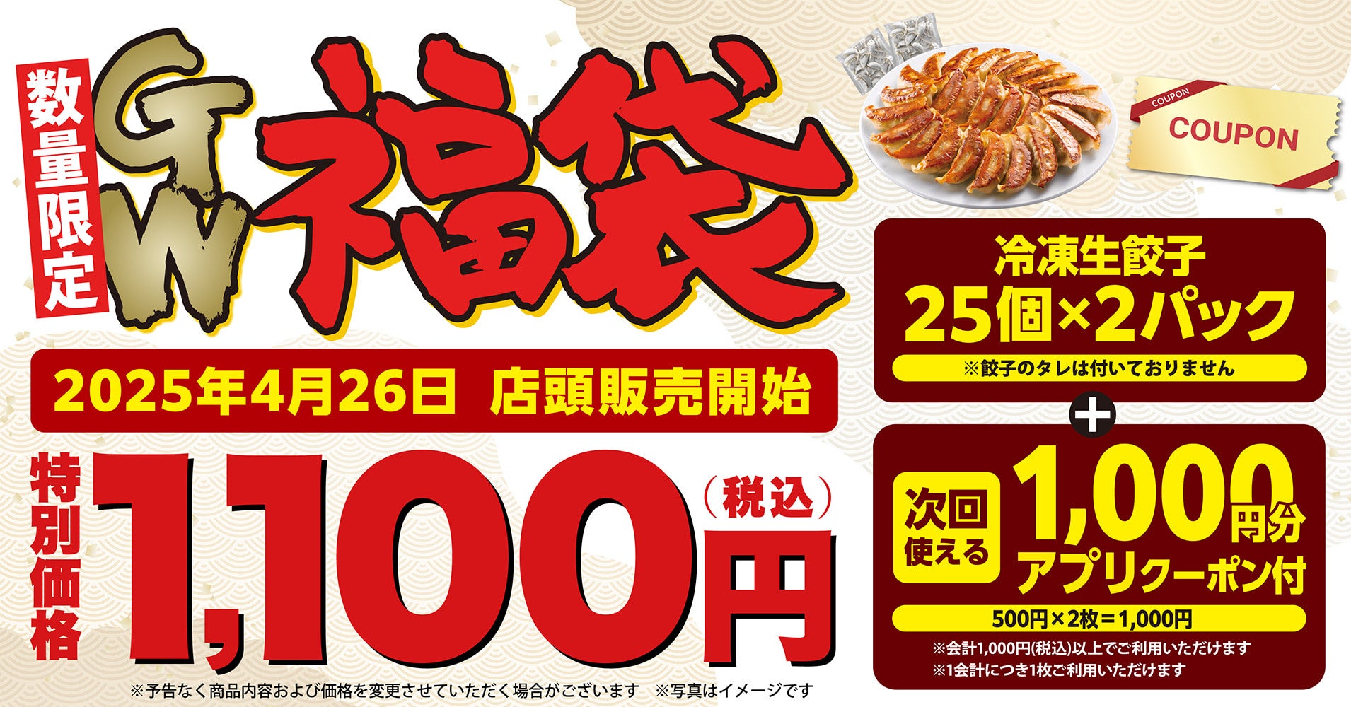 株式会社物語コーポレーション(本社:愛知県豊橋市/代表取締役社長:加藤 央之)が全国222店舗展開中の『丸源ラーメン』は、2025年4月26日(土)より、冷凍生餃子50個とお得なアプリクーポン2枚(1,000円分)がセットになった「丸源GW福袋」を1,100円(税込)で数量限定販売いたします。