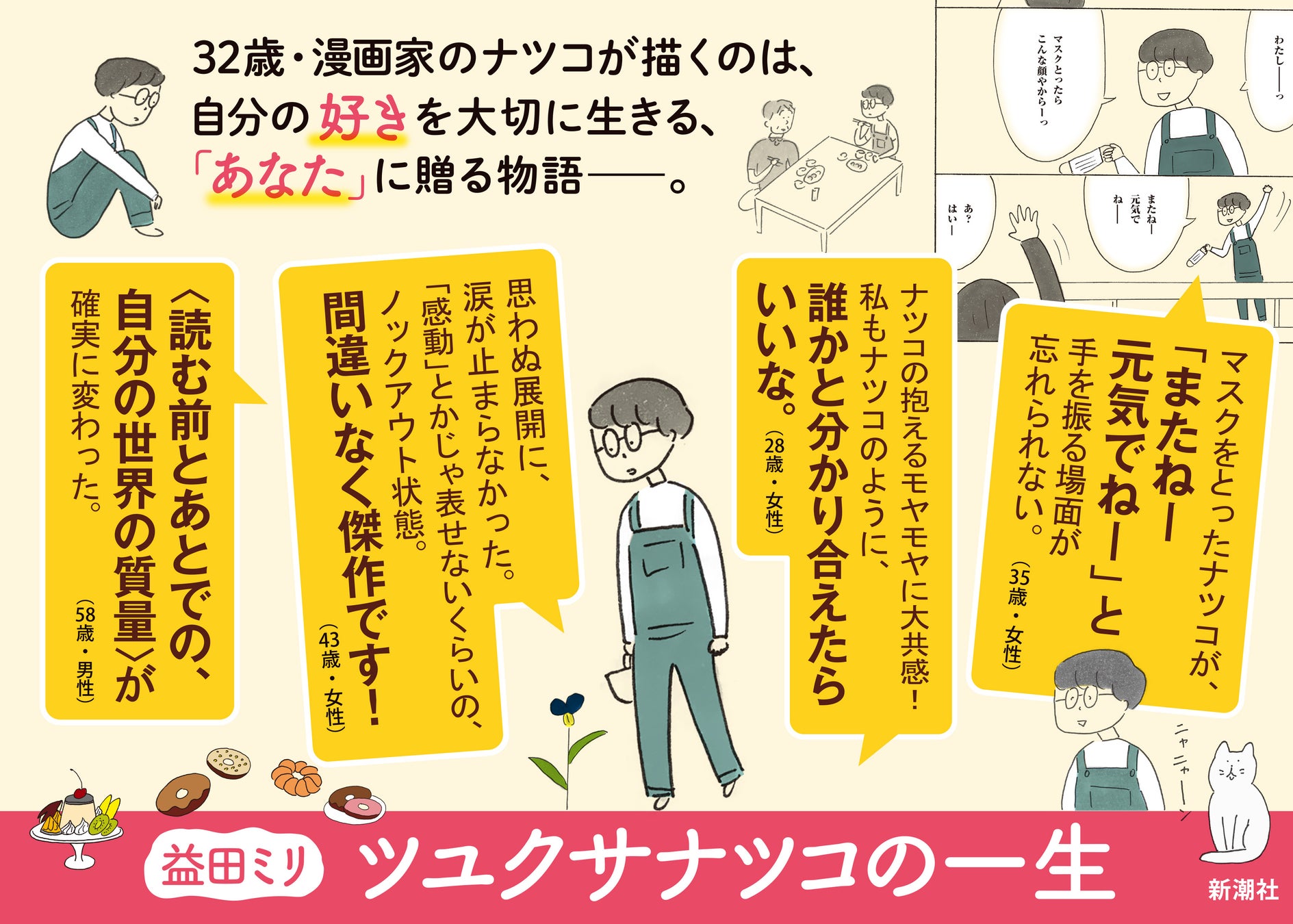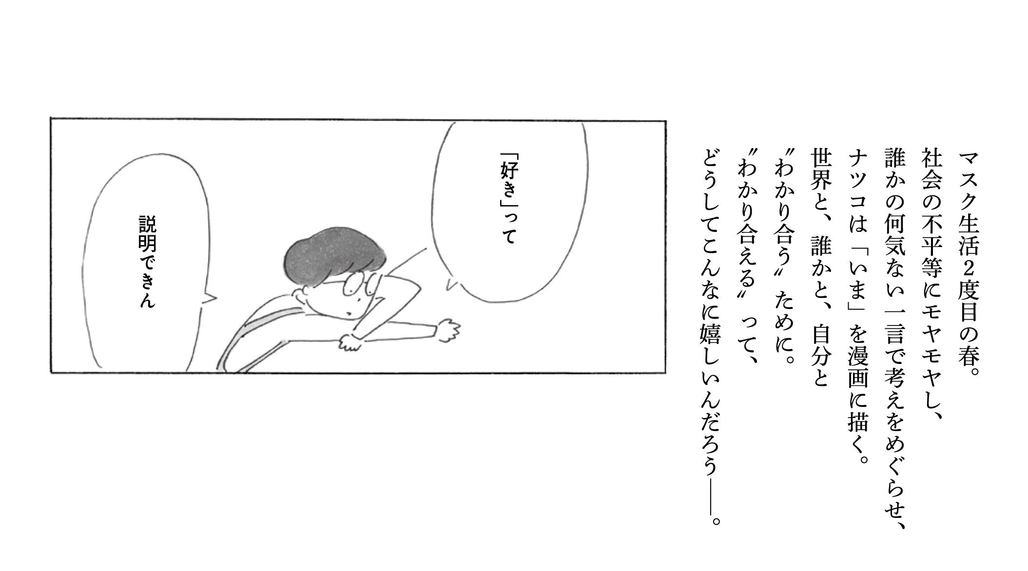 マスク生活2度目の春を過ごす、32歳・漫画家のナツコ。ナツコは「いま」を漫画に描きます。日々感じるモヤモヤ、社会の仕組み、アルバイト先に来たおじいさんのこと、戦争のこと、コロナで大学生活がままならないバイト仲間のこと……。描くことで、世界と、誰かと、自分と向き合えるから。“わかり合える”って、どうしてこんなに嬉しいんだろう、と。自分の「好き」を大切に生きる、「あなた」に贈る物語です。