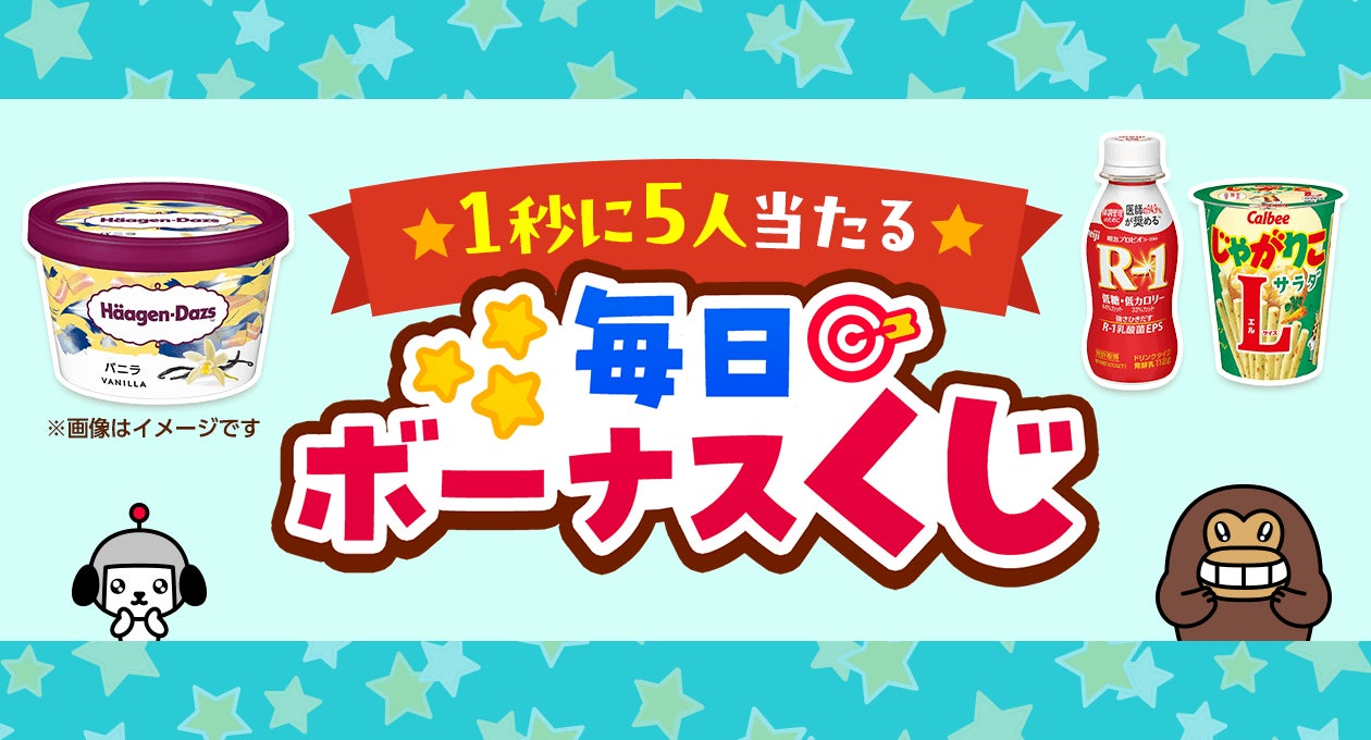 ※3 「毎日ボーナスくじ」は2024年9月2日より毎月開催しています。「通常開催時」とは、2025年1月分にあたる新春特別版「毎日ボーナスくじ」を除く、各月の開催分を指します。開始日および終了日は毎回異なりますので、ページ上部の「スタンプ獲得期間」にてご確認ください。