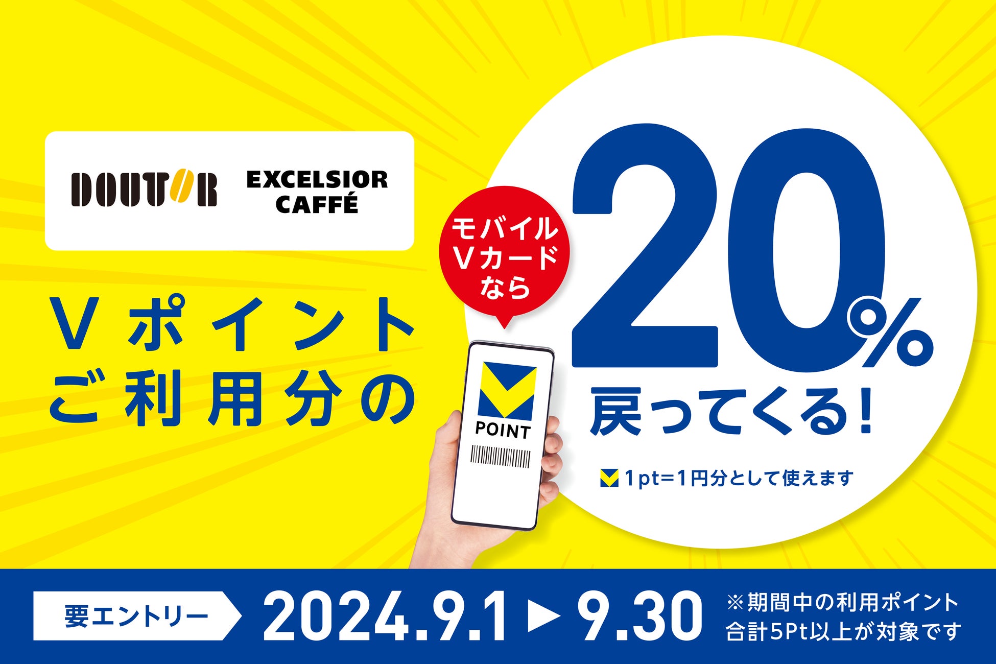 CCCMKホールディングス株式会社(本社:東京都渋谷区、代表取締役社長 兼 CEO:髙橋誉則、以下「CCCMKHD」)は、2024年9月1日(日)~9月30日(月)まで、株式会社ドトールコーヒー(本社:東京都渋谷区、代表取締役社長:星野正則、以下「ドトールコーヒー」)が展開する全国のドトールコーヒーグループ店舗で「モバイルVカード」を提示し、Vポイントを使ってお支払いすると、利用したVポイントの20%分が戻ってくるキャンペーンを開催いたします。