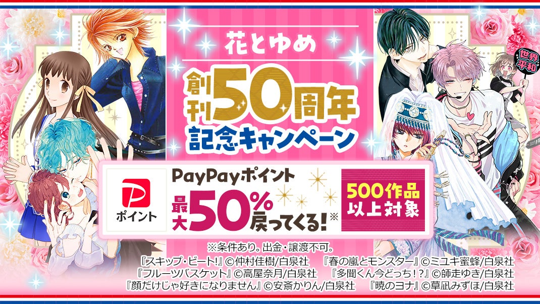 \3日間限定!ebookjapanで最大50%ポイント戻ってくる/白泉社「花とゆめ」創刊50周年を記念し、500作品以上がお得に購入できる!
