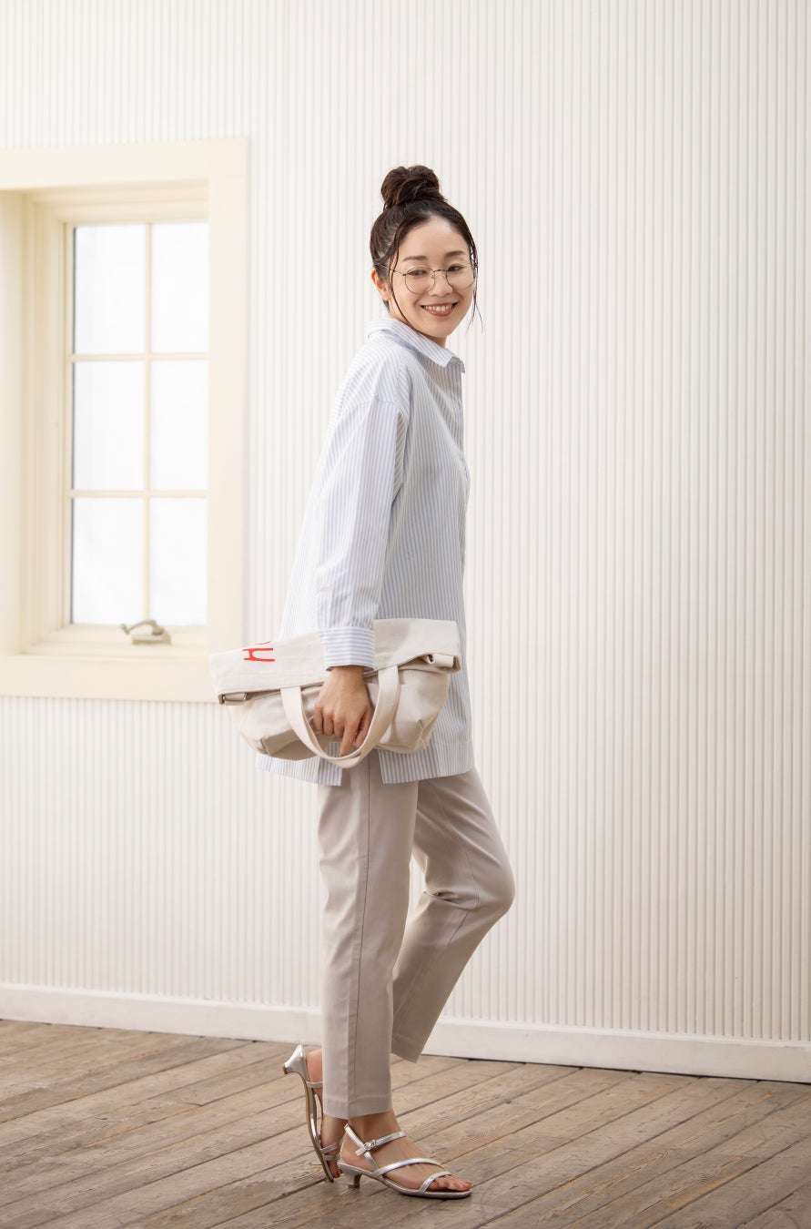 チュニックシャツ¥4,290(税込)、らく美パン テーパード¥3,850(税込)、サングラス ¥1,980(税込)
