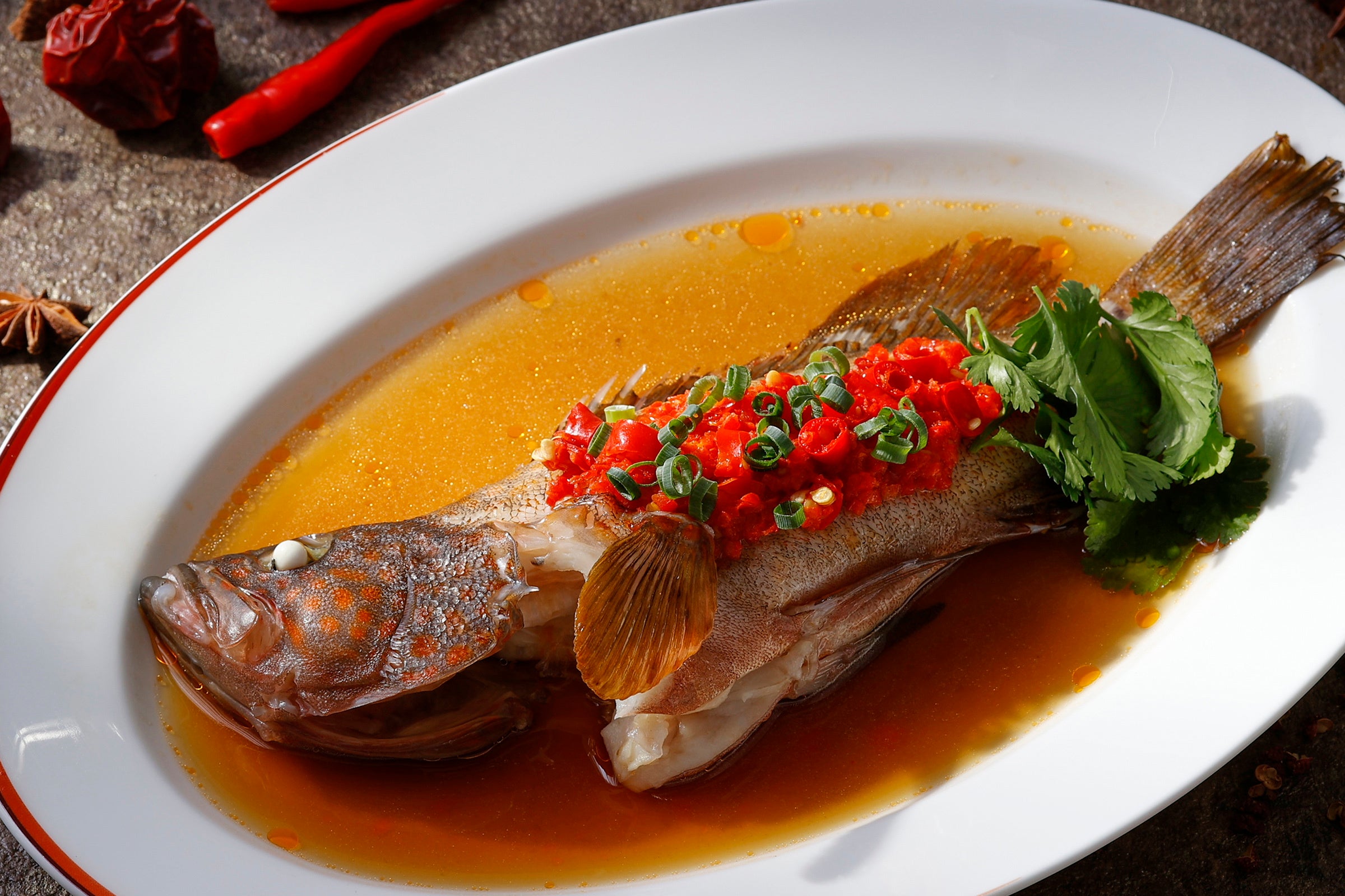 川魚の代わりに広東料理で高級魚とされるハタを使用し香港スタイルにアレンジした唐辛子蒸し。フレッシュと漬物にした唐辛子を使うことで奥行きのある辛味に仕上げたダイナミックな料理。
