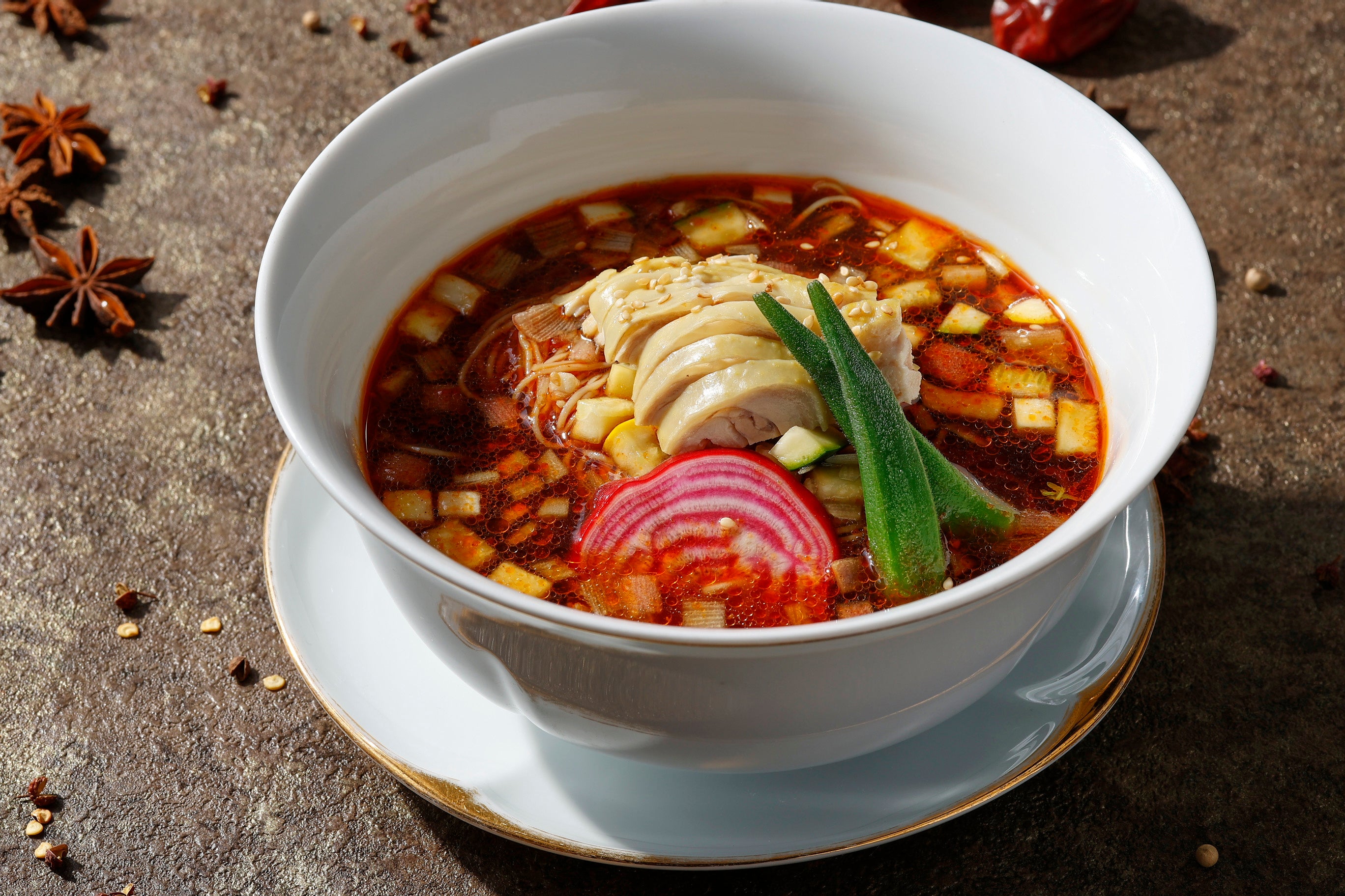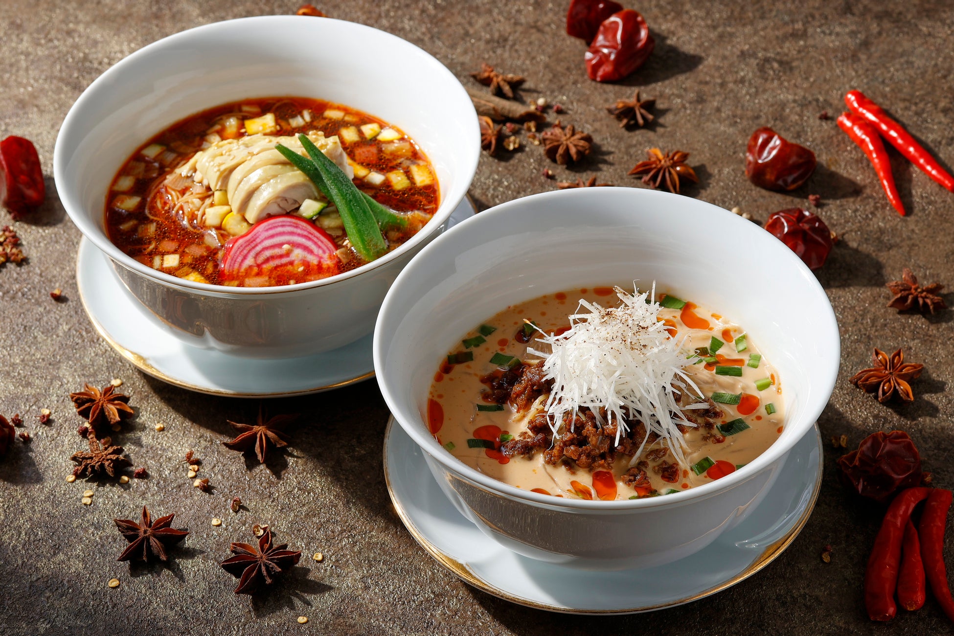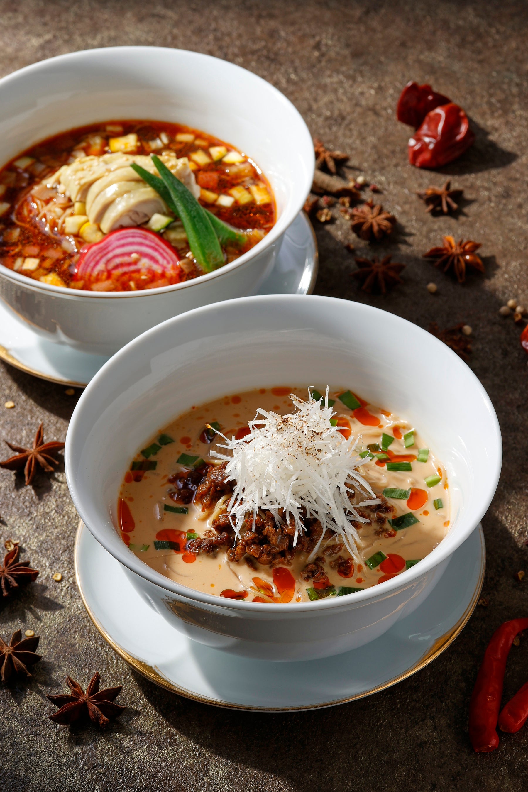 広東料理の神髄を余すところなく表現しながら創造性あふれる料理をご提供する広東料理「龍天門」では、中国料理ならではの香辛料をふんだんに用いた料理を5品、夏限定でご提供いたします。龍天門 総料理長 和栗邦彦が腕を揮う本場の香り漂う広東料理の数々で、暑い季節にふさわしいピリリとした辛さやしびれる刺激を豊かな香りとともに楽しみながら、スパイスの奥深い世界をご堪能いただきます。2種類の麺料理は冷たいスープでご用意。スパイシーさと冷たさの両方をお楽しみいただけます。