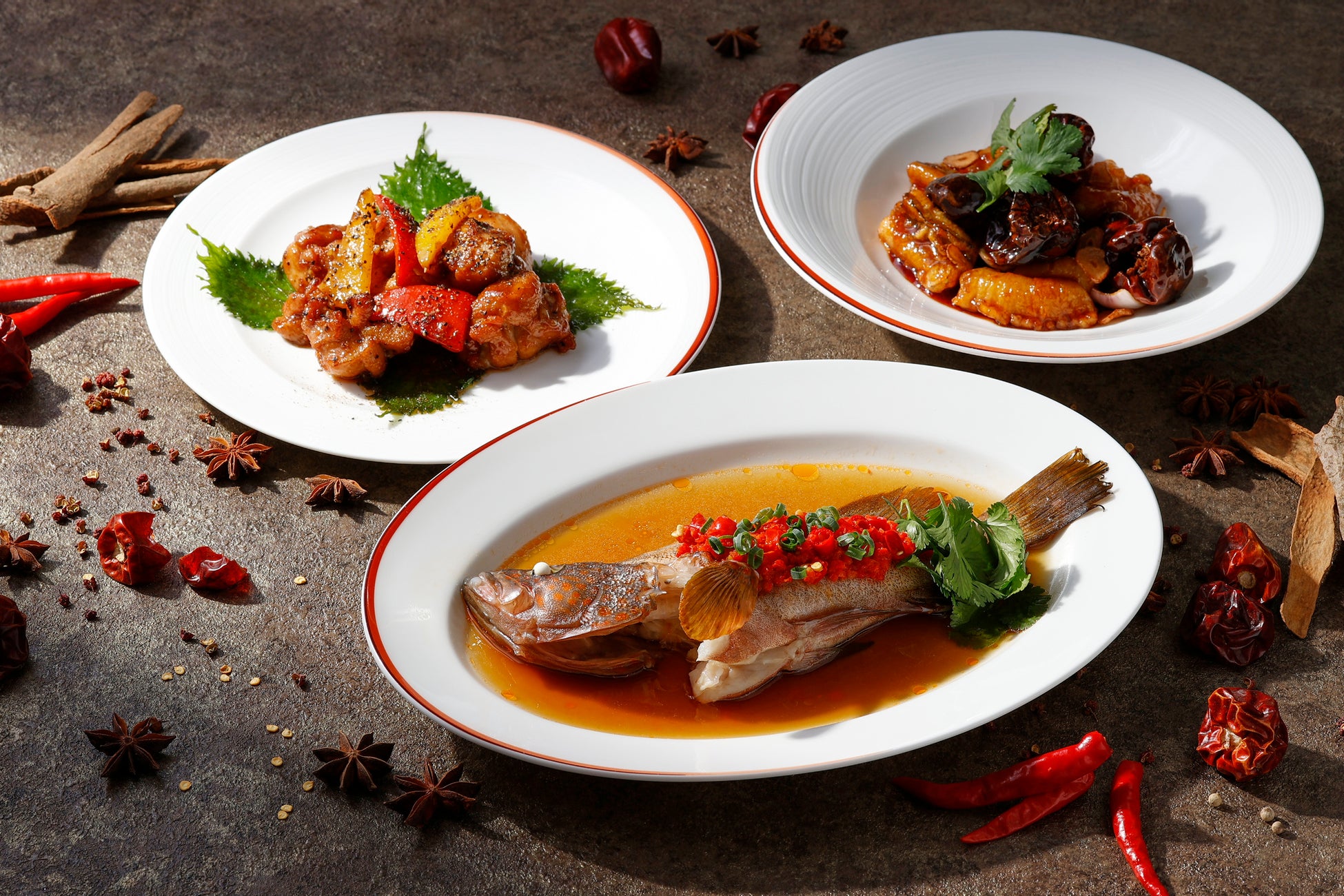 広東料理で高級魚として知られるハタを唐辛子とともに蒸しあげた『姿ハタの唐辛子蒸し』や、激辛で知られる朝天辣椒をカシューナッツと一緒に炒め味わい深く仕上げた『海鮮甘辛炒め』など、夏の疲れを吹き飛ばすようなスパイシーな料理を5品ご用意いたします。