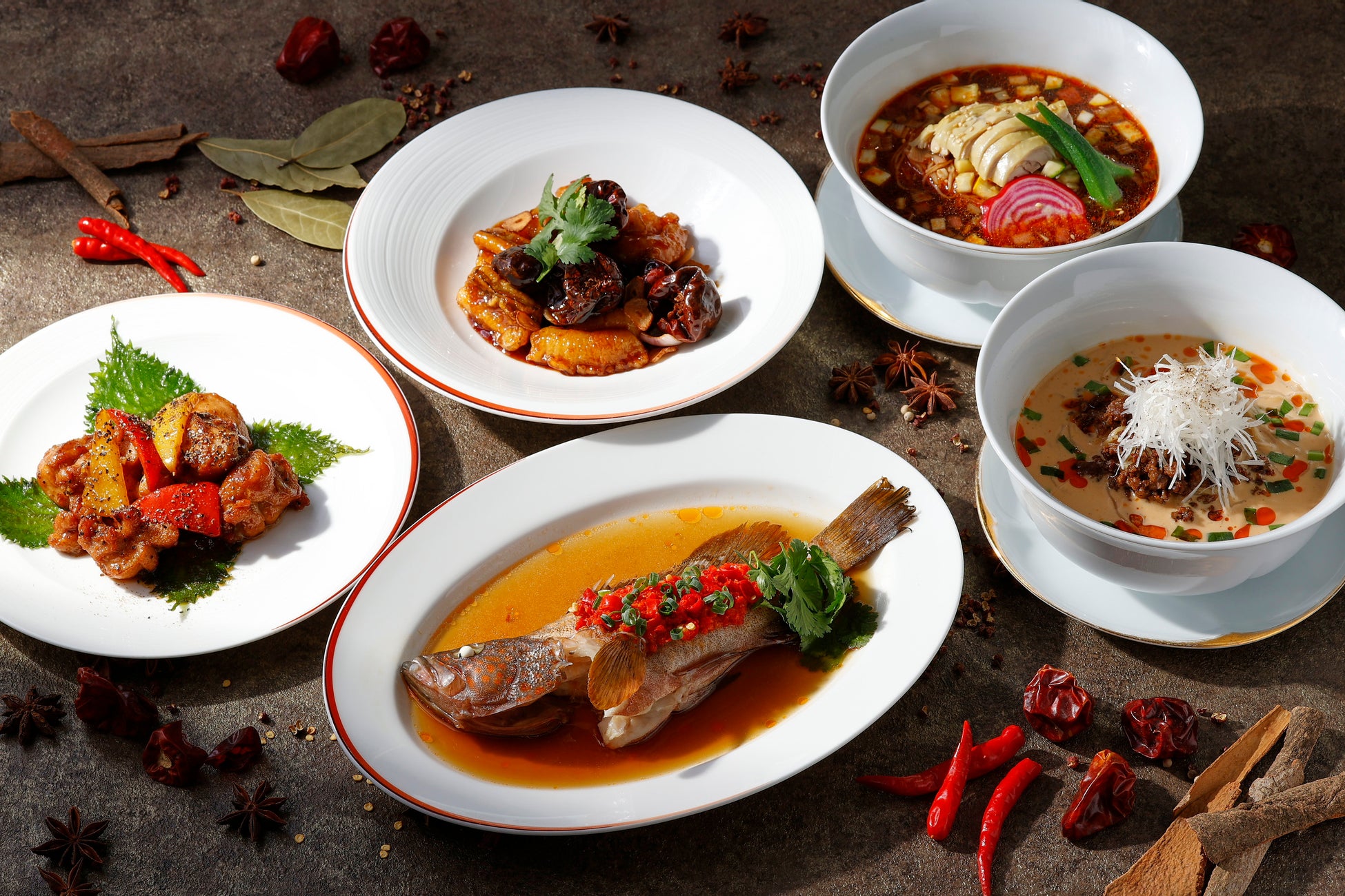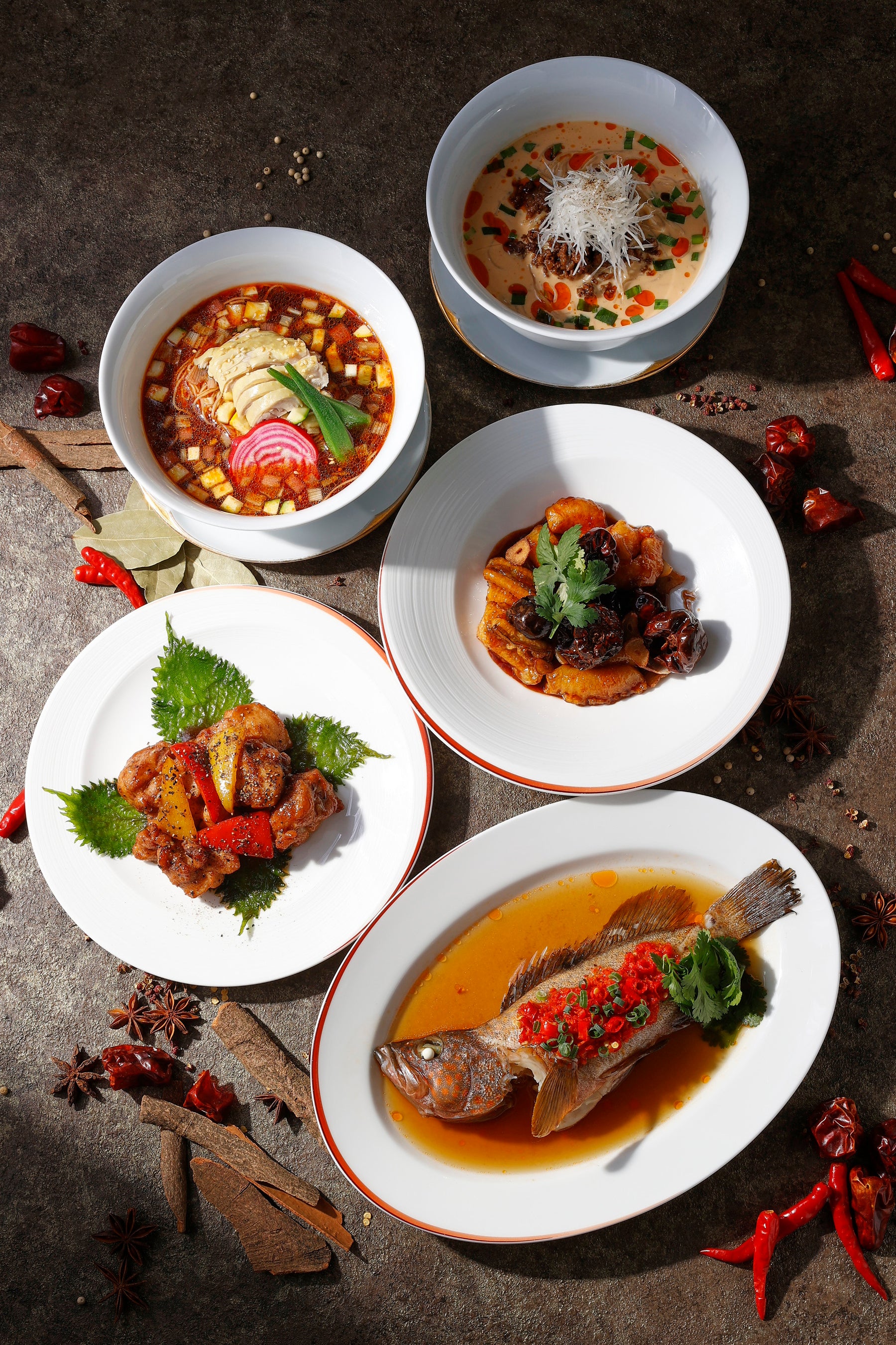 ピリッと辛い『姿ハタの唐辛子蒸し』、辛さ際立つ朝天辣椒の『海鮮甘辛炒め』他、自家製辣油や花山椒を使用したスパイシーさと冷たさを楽しむ2つの麺料理など