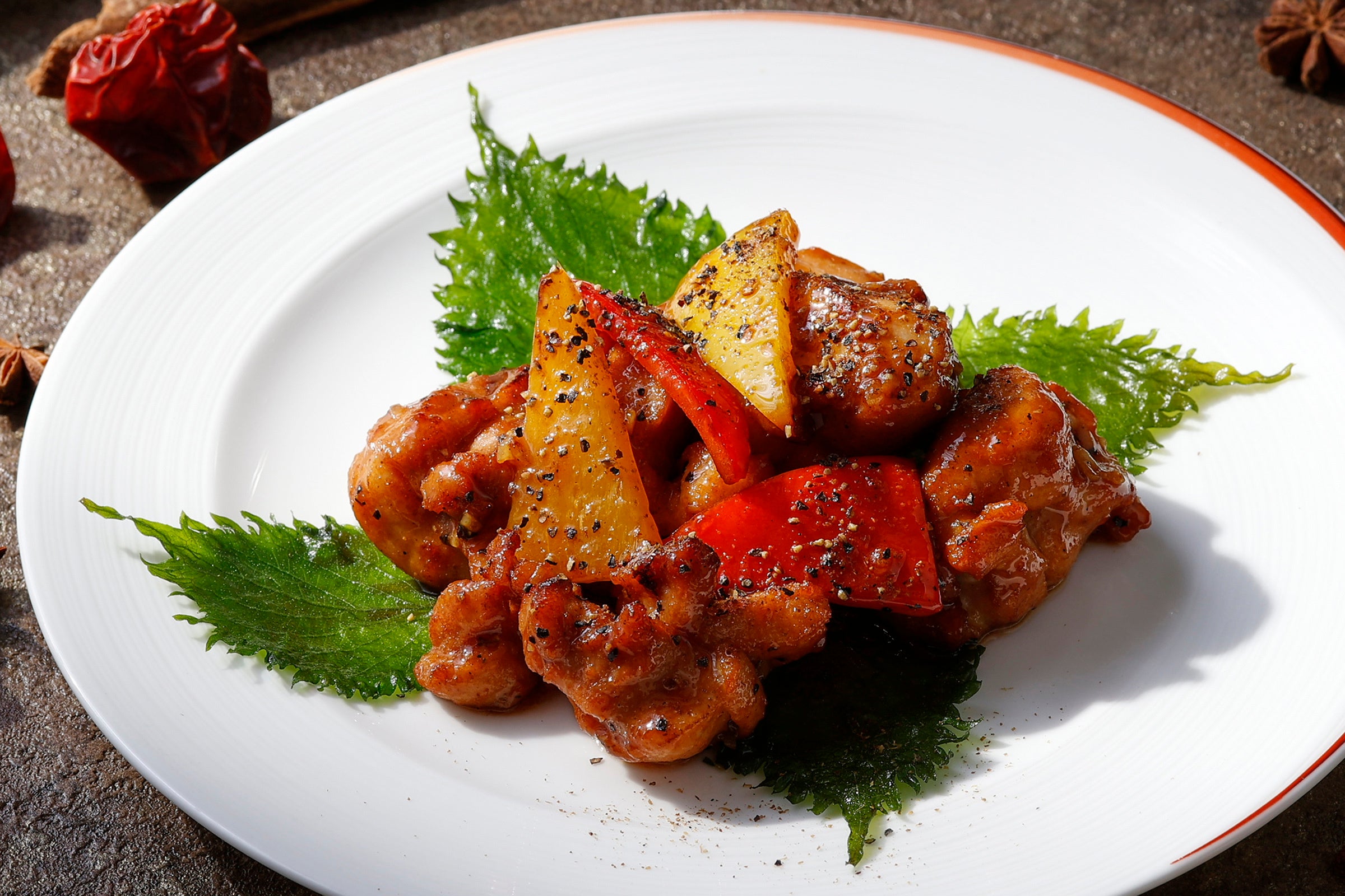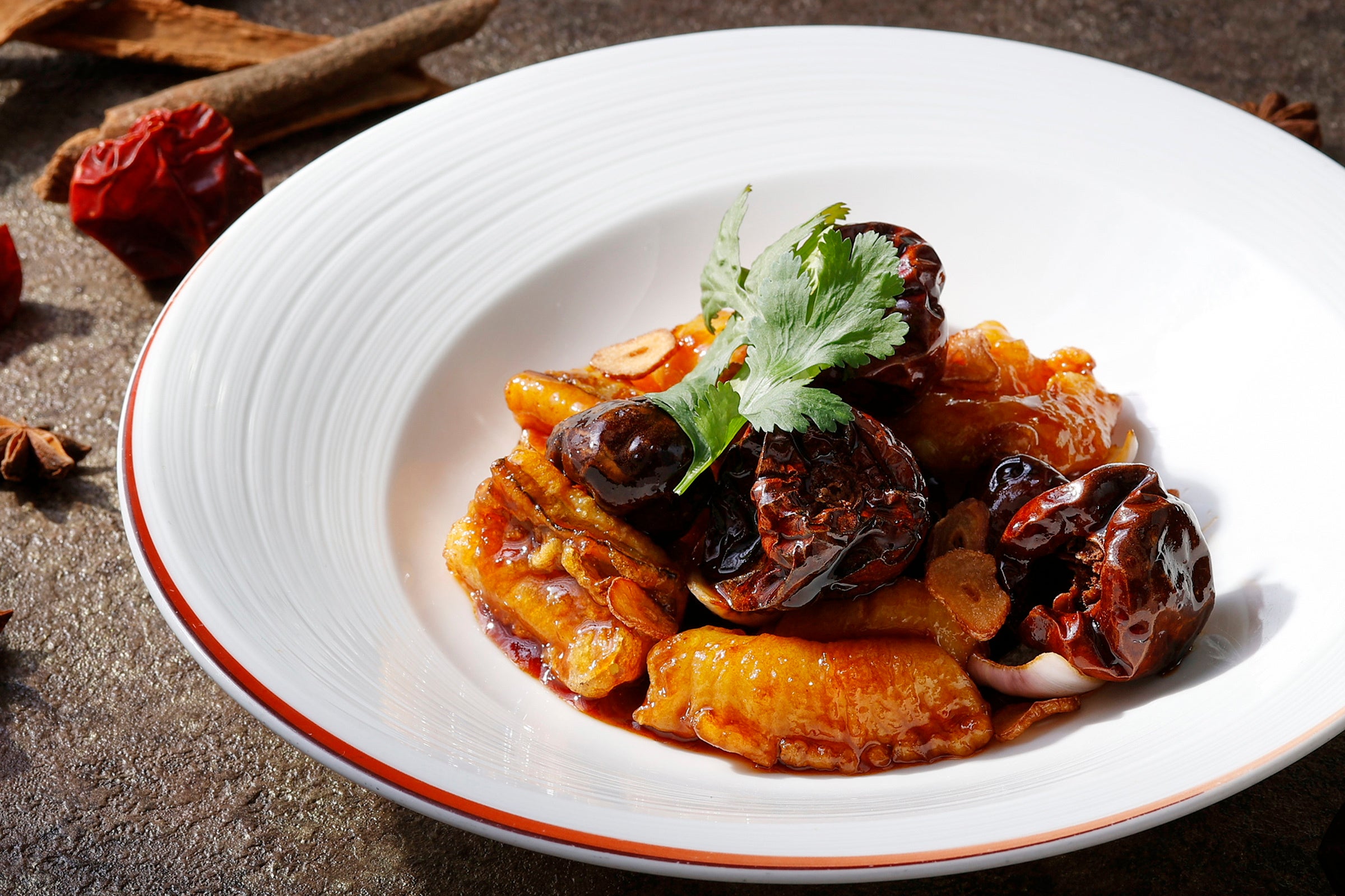 清朝の宮廷料理をアレンジした料理。辛さ際立つ「雲南朝天辣椒」とカシューナッツの香り豊かで上品なハーモニーを楽しめる一皿。