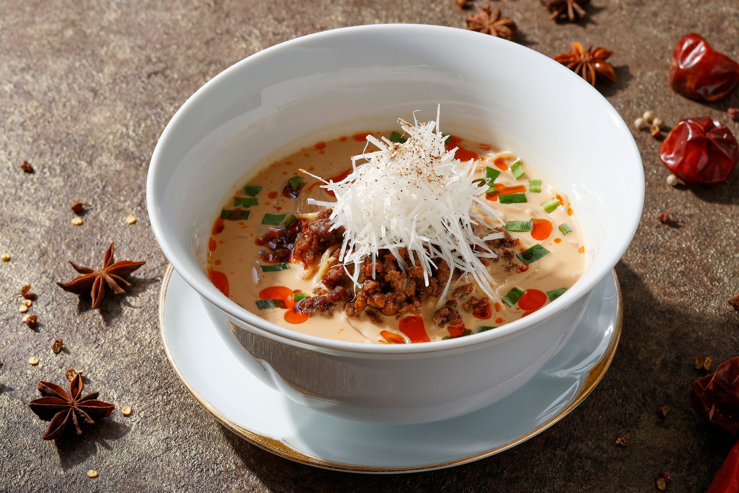 ピリッとした唐辛子の辛みと花山椒の刺激をバランスよくきかせた蒸し鶏の冷たい麺。白胡麻とこだわりの自家製辣油をアクセントに複雑な辛味のハーモニーをご体験いただけます。