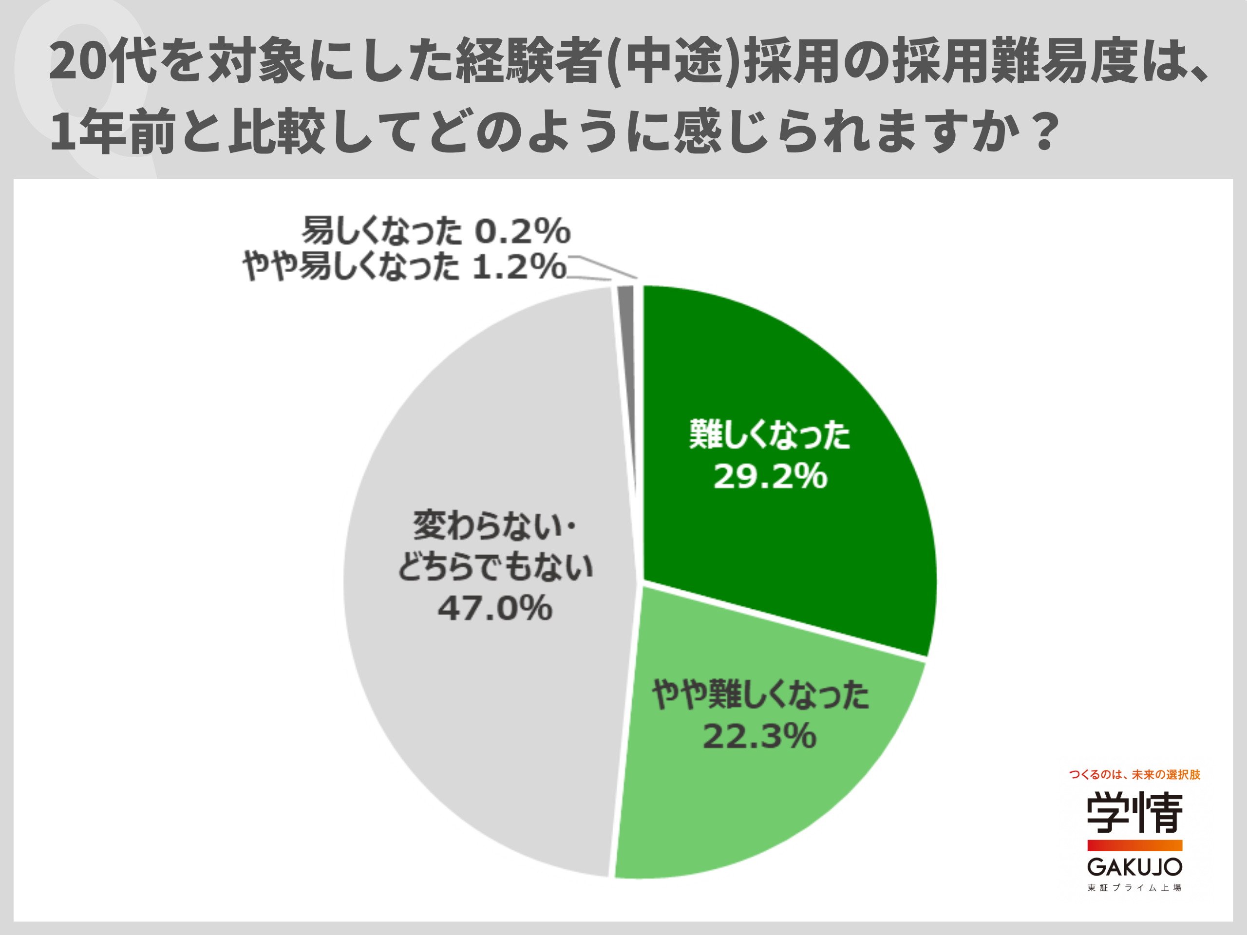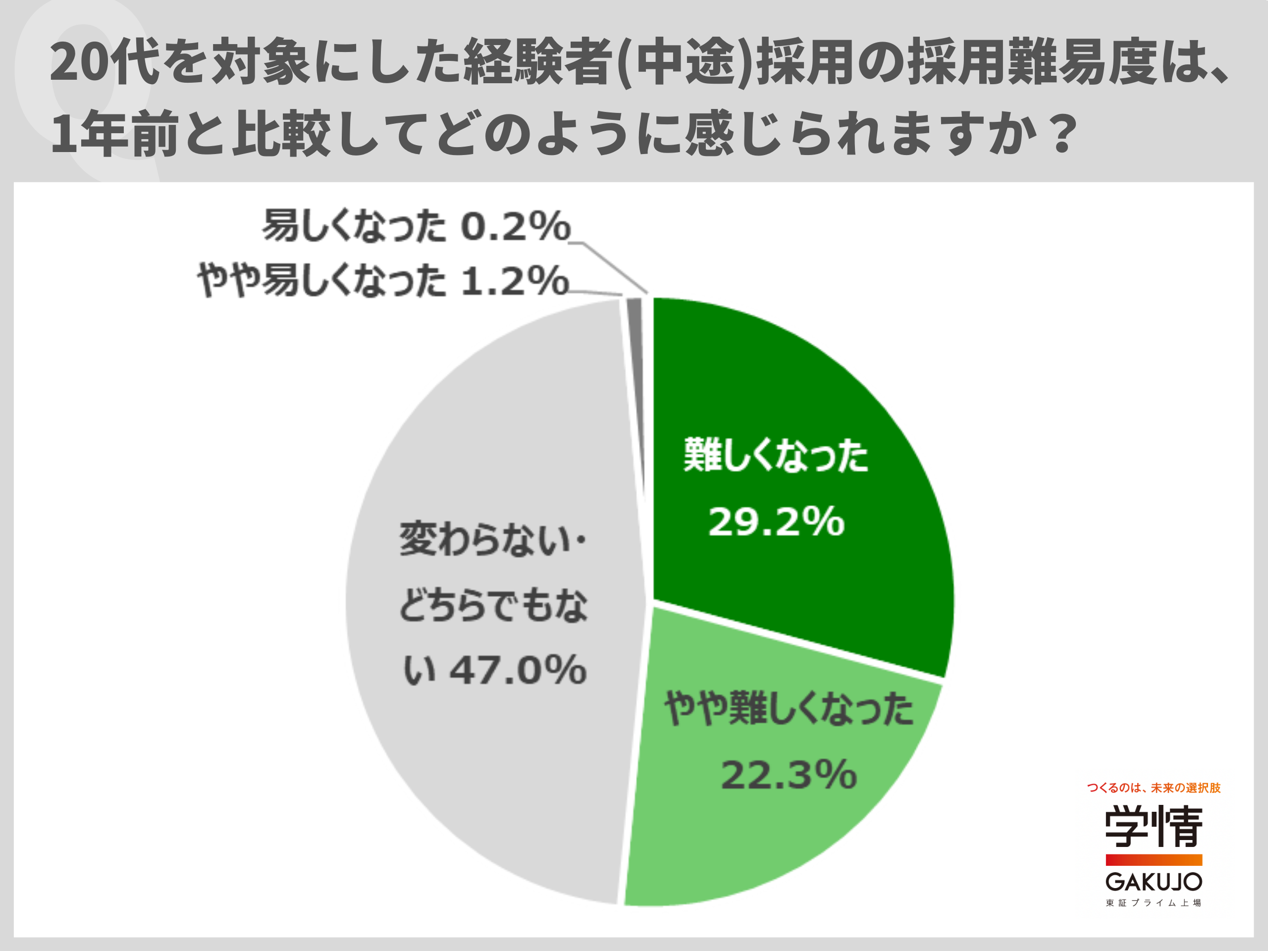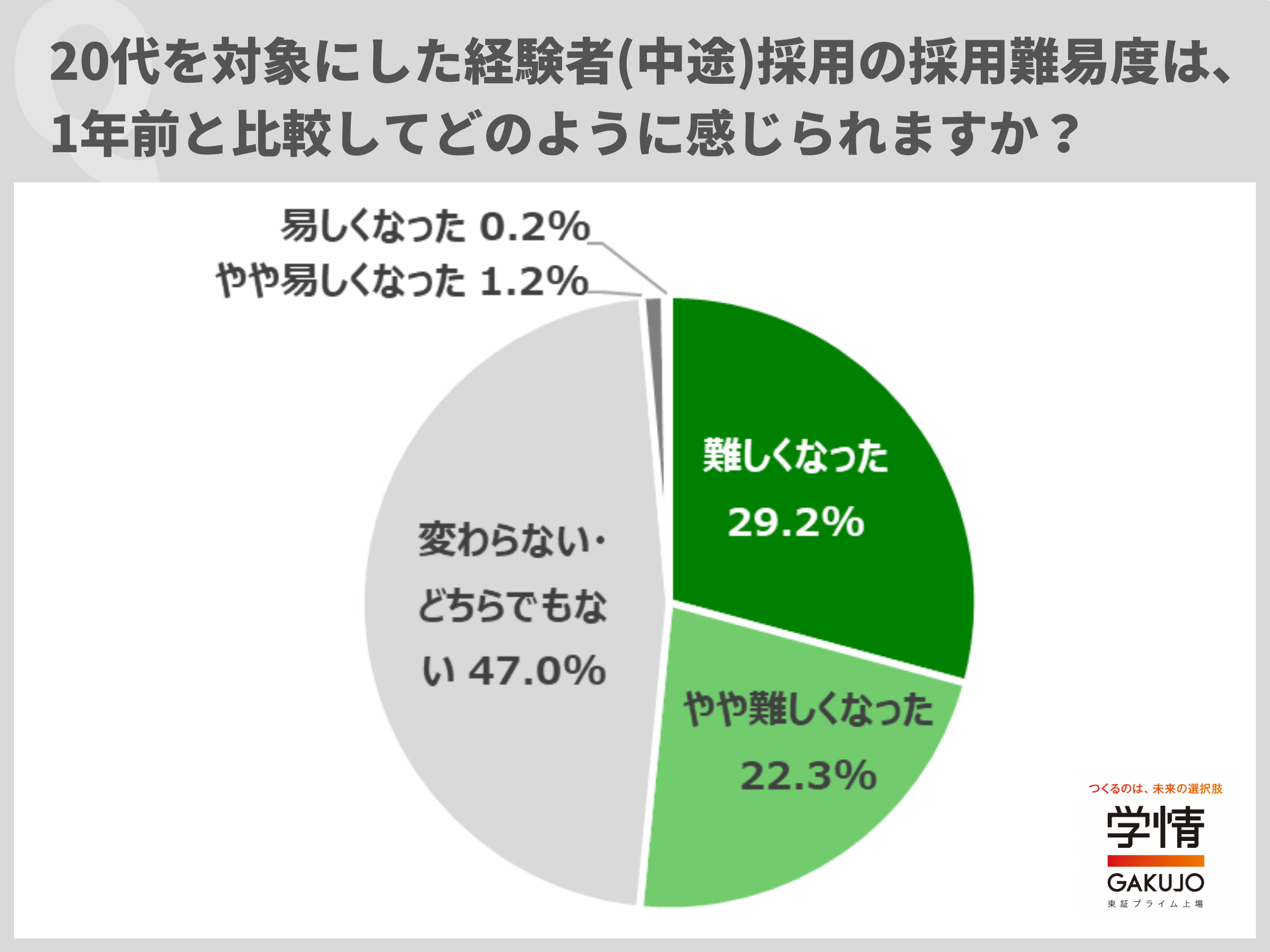 経験者(中途)採用の拡大に伴い、20代を対象にした採用を強化する企業が増えています。20代を対象にした経験者(中途)採用の難易度について調査しました。