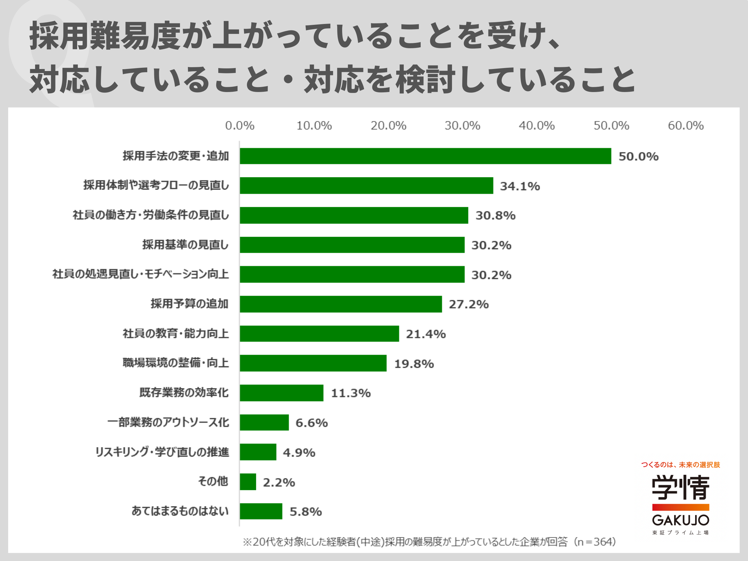 20代を対象にした経験者(中途)採用の難易度が上がっていることを受け、対応していること・対応を検討していることは、「採用手法の変更・追加」が50.0%で最多。次いで、「採用体制や選考フローの見直し」34.1%、「社員の働き方・労働条件の見直し」30.8%、「採用基準の見直し」30.2%、「社員の処遇見直し・モチベーション向上」30.2%が続きました。