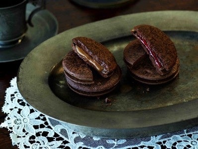 風味豊かな2種類のソースをミルクチョコレートでコーティングし、さっくりと焼き上げたココアクッキーでサンドした、贅沢な味わいのショコラサンドです。 濃厚なヘーゼルナッツクリームと、爽やかな酸味のストロベリーソースの2つの味のアソートで。