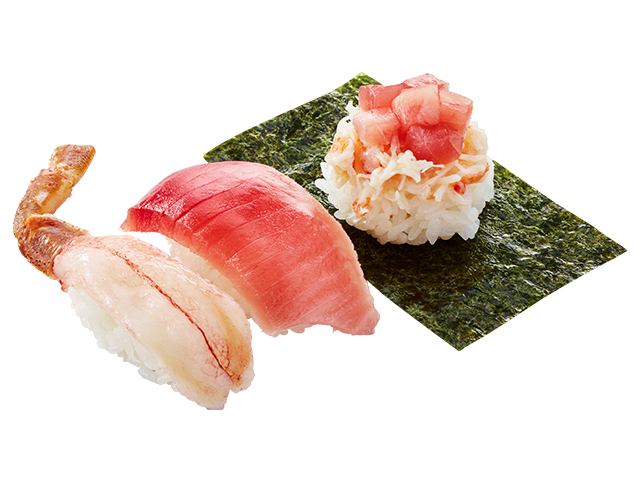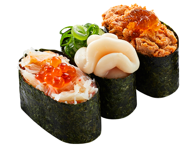冬の人気ネタ三貫をセットにしました。ぜひこの一皿で、冬ネタを食べ納めしてください!