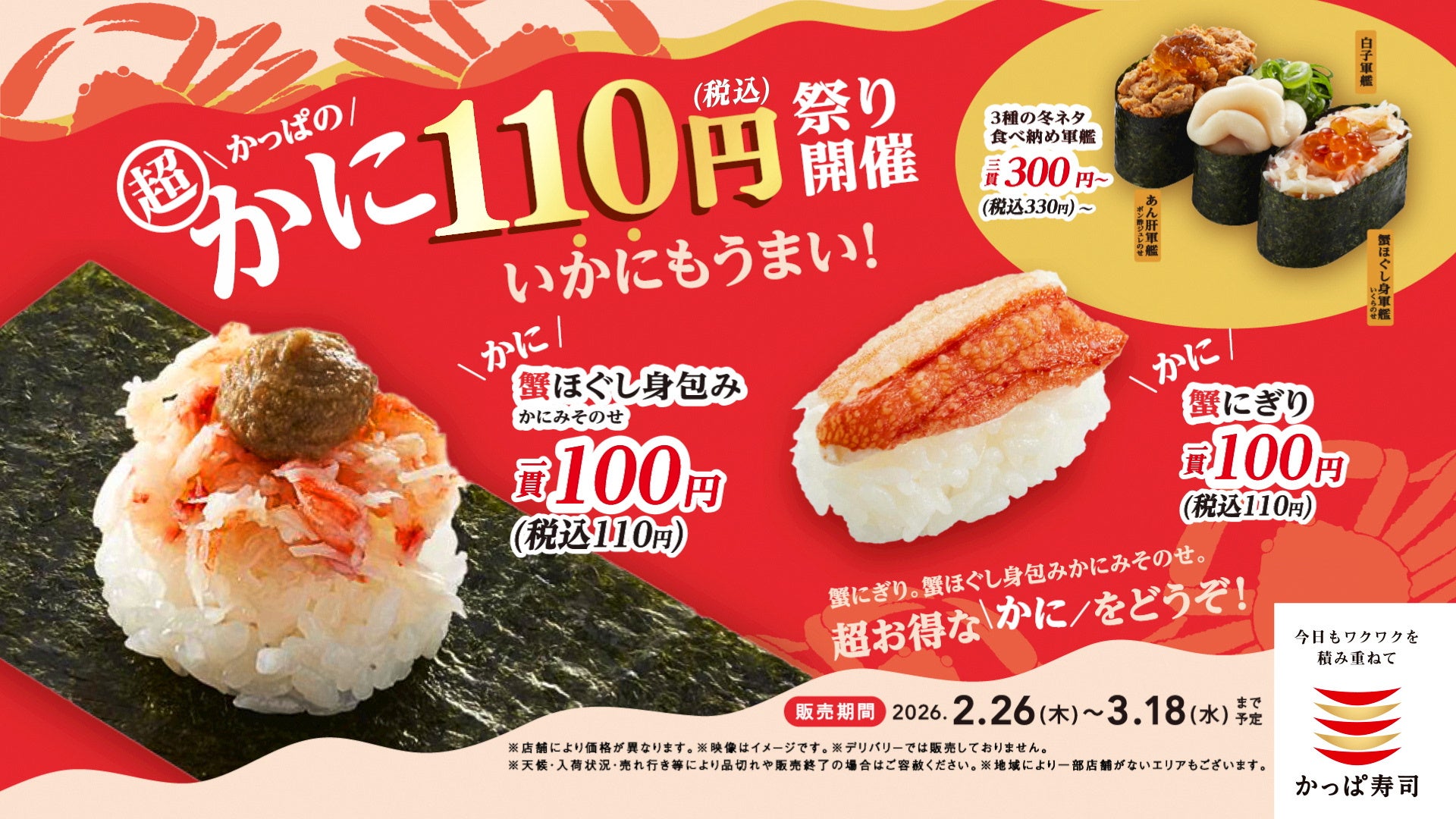 コロワイドグループのかっぱ寿司(カッパ・クリエイト㈱ 本社:神奈川県横浜市、代表取締役社長:山角豪)は、2026年2月26日(木)~3月18日(水)の期間、「かっぱの超かに110円祭り」をかっぱ寿司全店にて開催いたします。